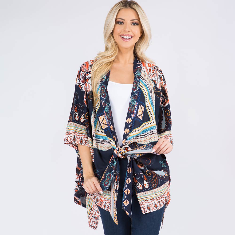 • Statement kimono wrap featuring a bold patchwork-inspired design and adjustable tie-front detail. Designed for effortless layering with a relaxed silhouette that elevates everyday outfits, travel looks, and boutique styling. Ideal as a versatile outer layer for casual wear, festivals, or resort-ready collections.