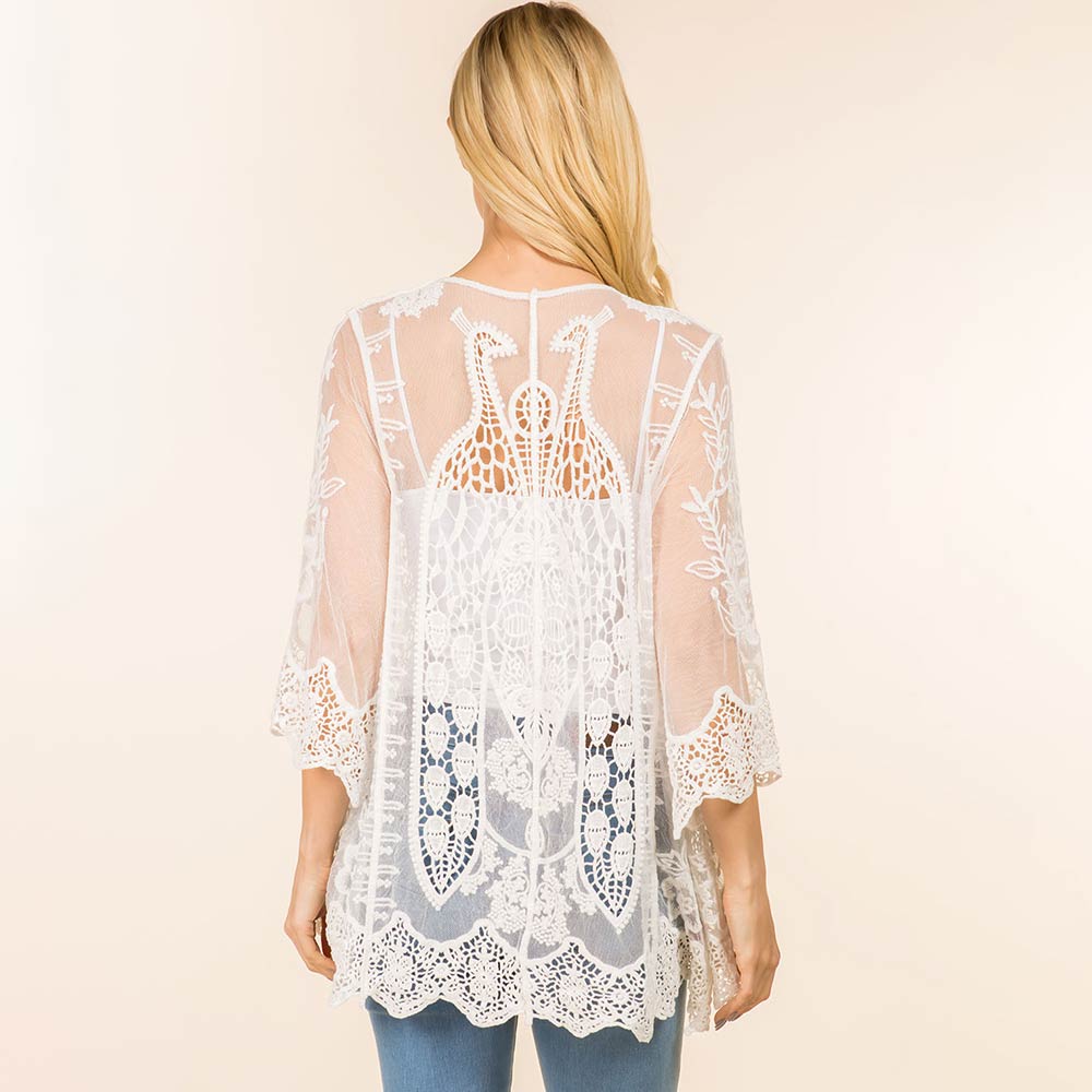 • Elegant open front kimono cardigan designed with intricate floral lace detailing for effortless layering. Perfect for casual outfits or elevated looks, it adds soft coverage, movement, and a flattering silhouette for everyday wear, travel, or special occasions.