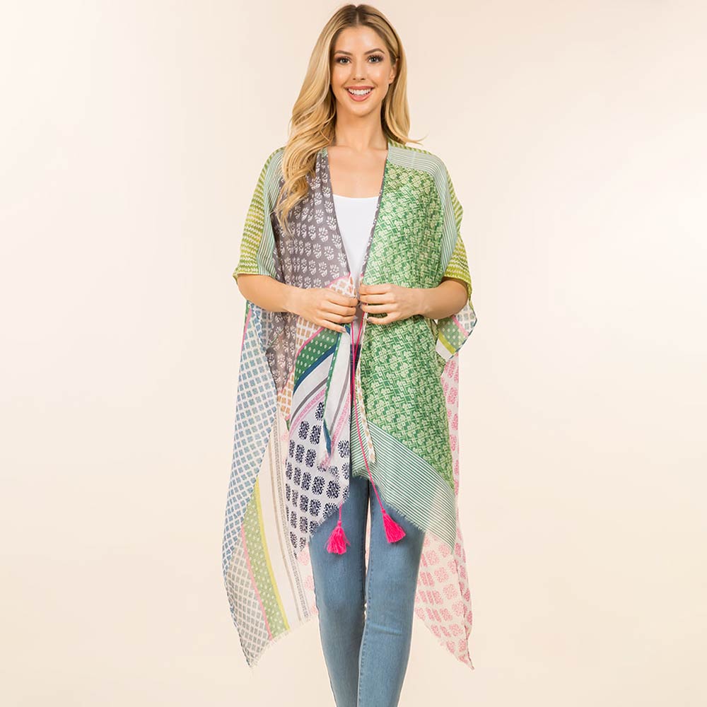 • Effortlessly elevate everyday outfits with this patchwork print open front kimono. Designed for versatile layering, it drapes beautifully over casual or dressy looks. A lightweight statement piece perfect for boutiques, seasonal styling, and trend-focused collections.
