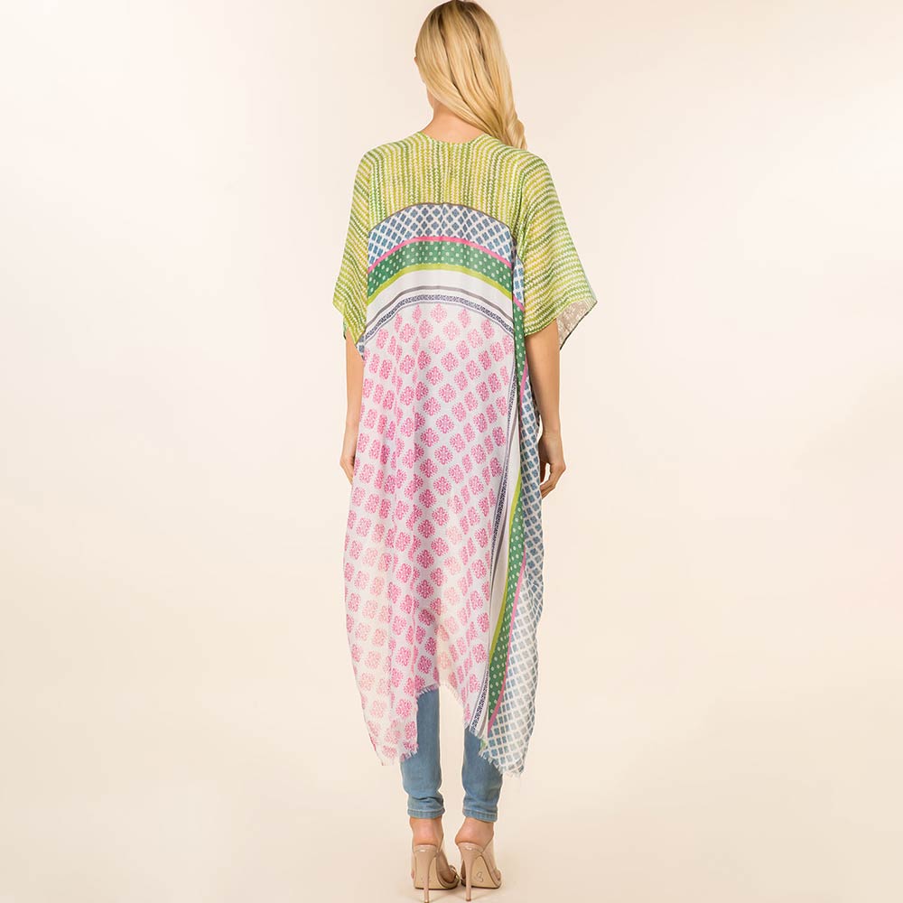 Geometric Patchwork Pattern Open Front Long Kimono Poncho