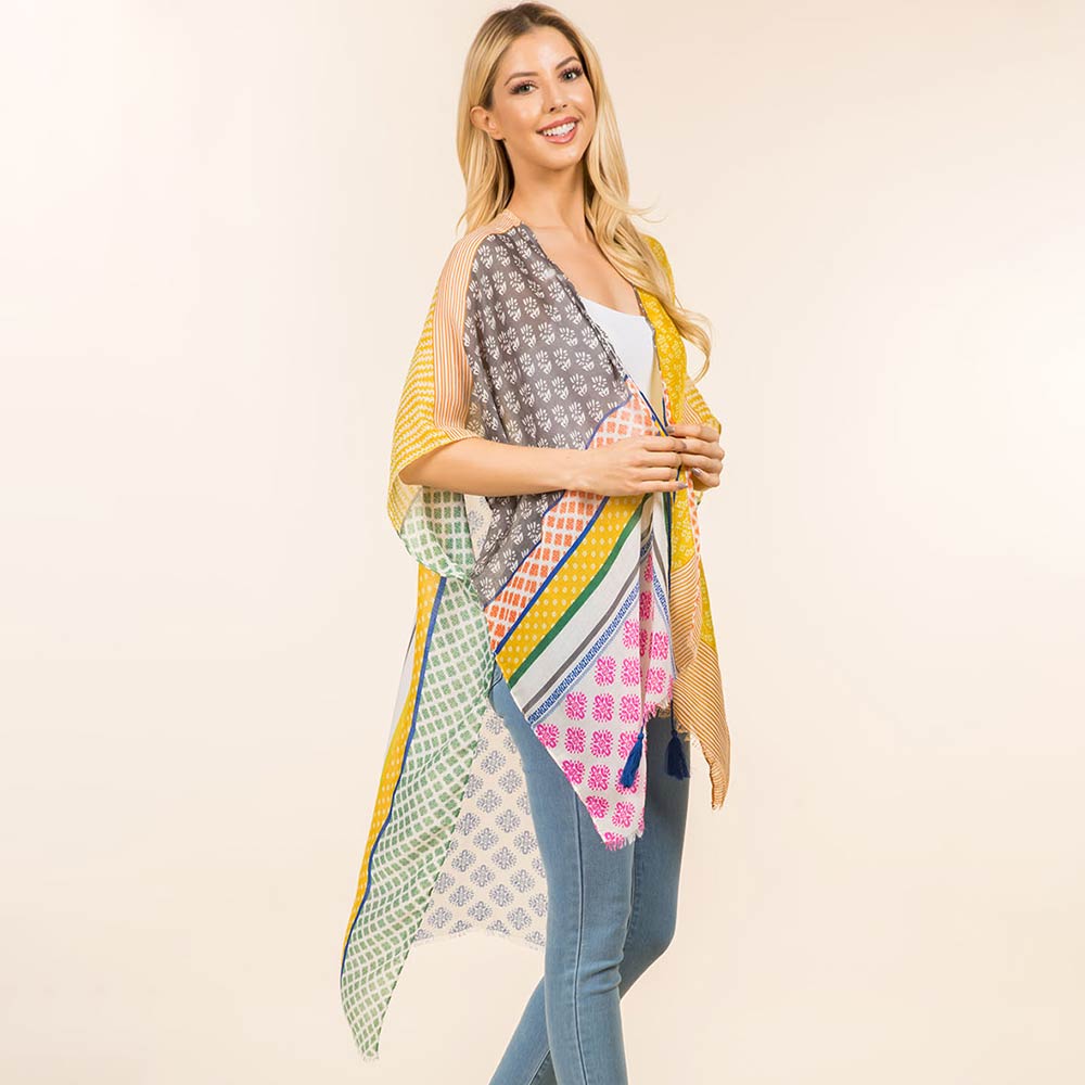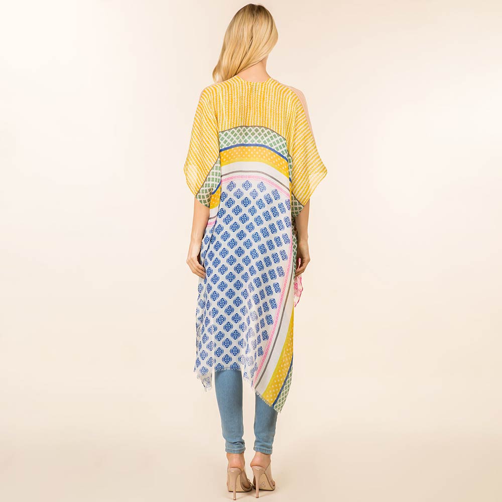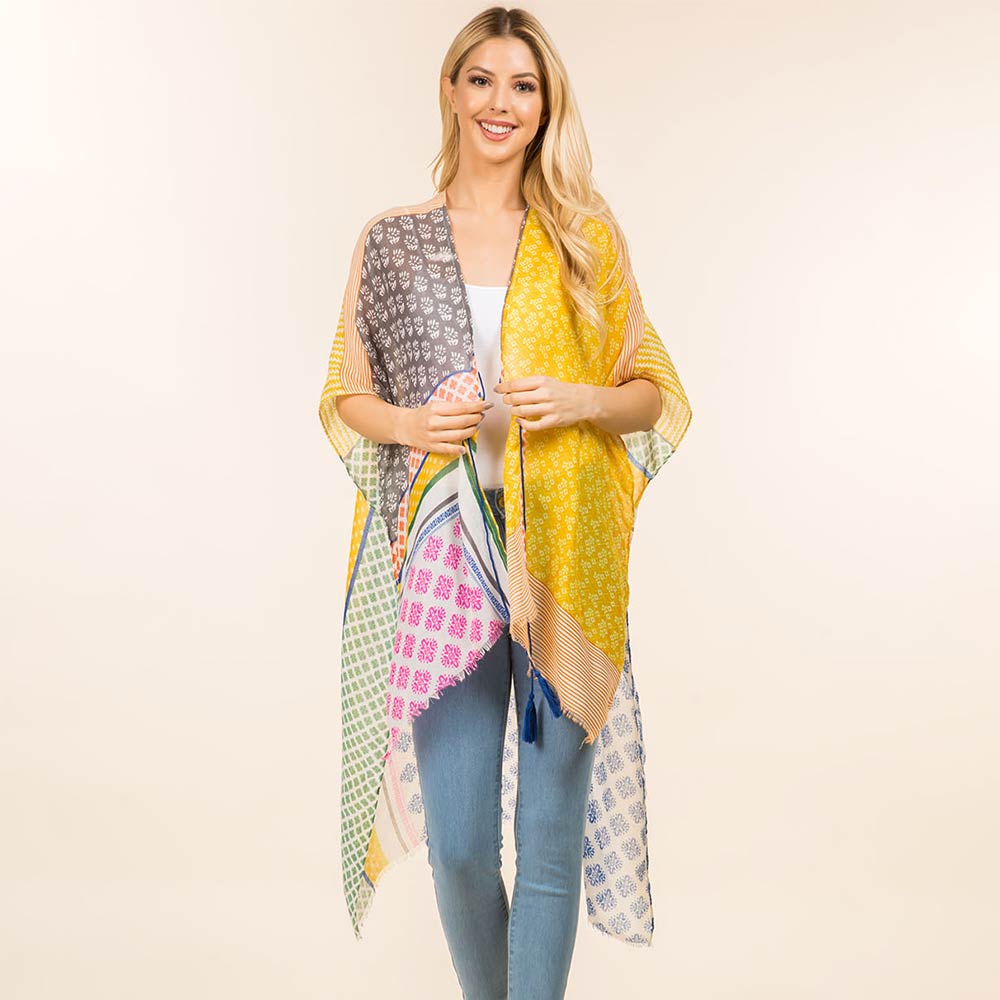 • Effortlessly elevate everyday outfits with this patchwork print open front kimono. Designed for versatile layering, it drapes beautifully over casual or dressy looks. A lightweight statement piece perfect for boutiques, seasonal styling, and trend-focused collections.