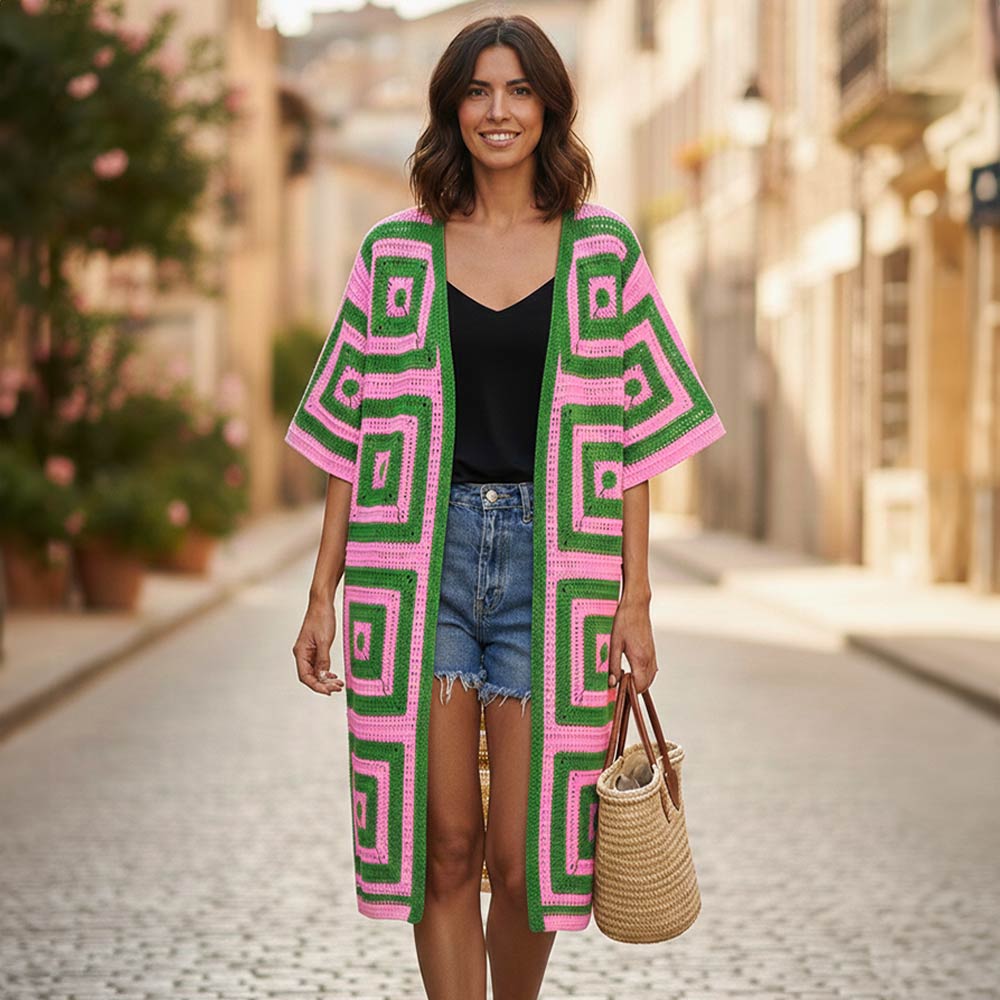 Details • Size : 21" X 40.6" • Material : 100% Acrylic • This granny square crochet long cardigan features an open-front silhouette with bold geometric panels for a statement look. Designed for effortless layering, it adds texture and movement to everyday outfits. Perfect for boutique fashion collections, seasonal transitions, casual styling, and boho-inspired wardrobes.