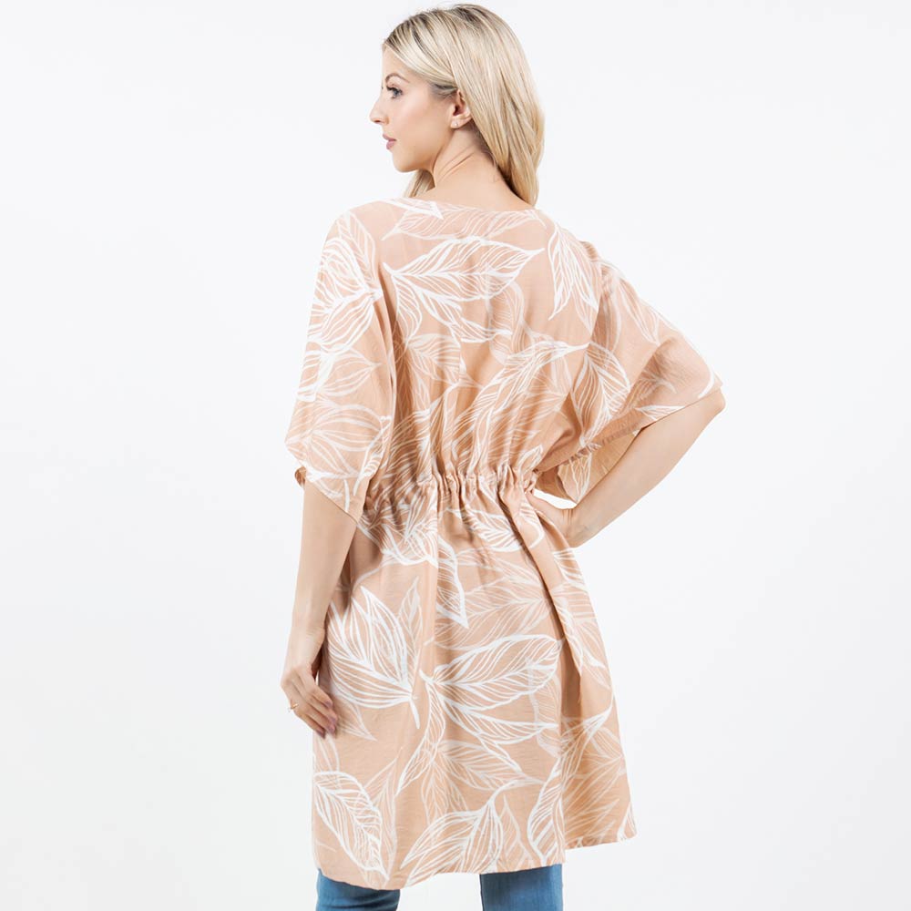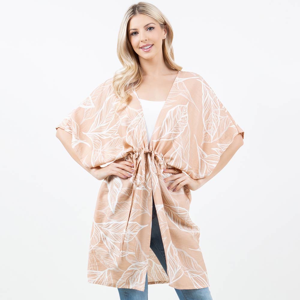 • Flowy kimono-style wrap designed with an allover leaf print and an adjustable drawstring waist for a flattering, relaxed fit. Easy to layer over casual outfits or resort looks for everyday wear or travel. A versatile fashion piece ideal for gifting and boutique collections seeking effortless style.