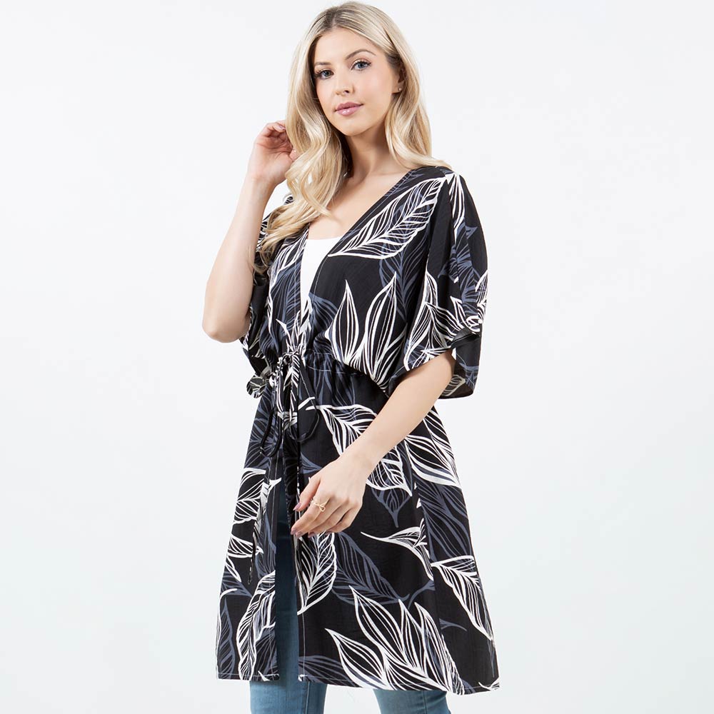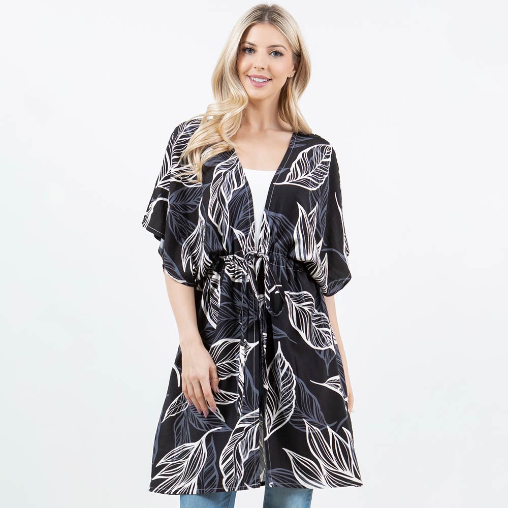 • Flowy kimono-style wrap designed with an allover leaf print and an adjustable drawstring waist for a flattering, relaxed fit. Easy to layer over casual outfits or resort looks for everyday wear or travel. A versatile fashion piece ideal for gifting and boutique collections seeking effortless style.