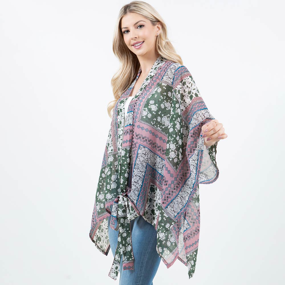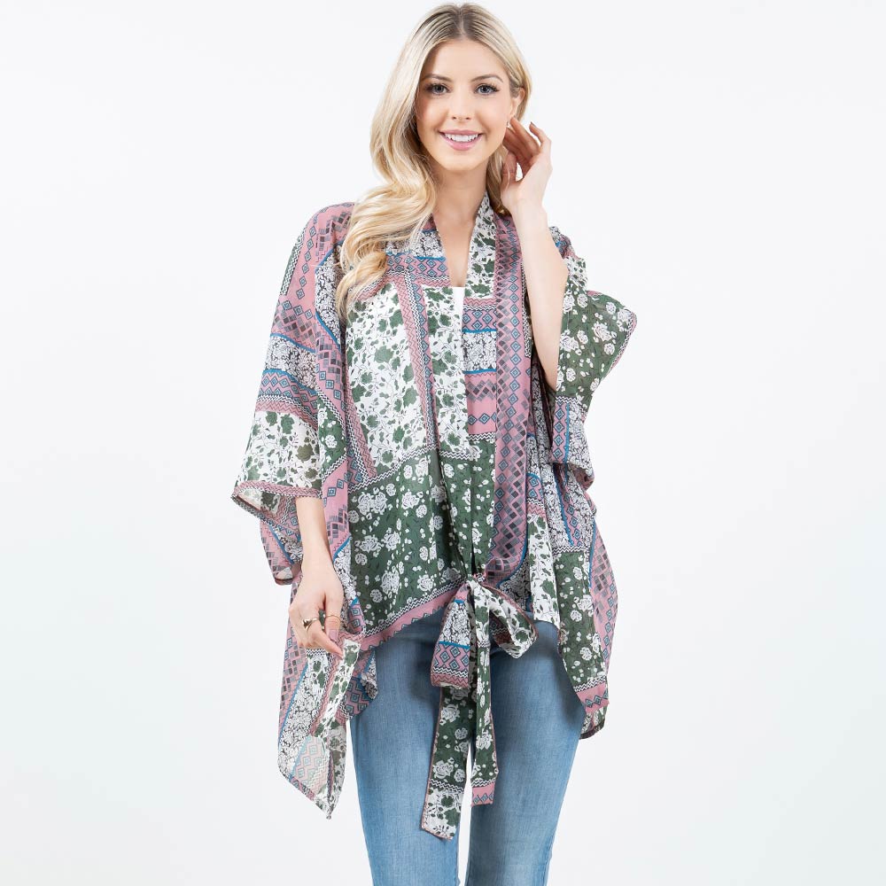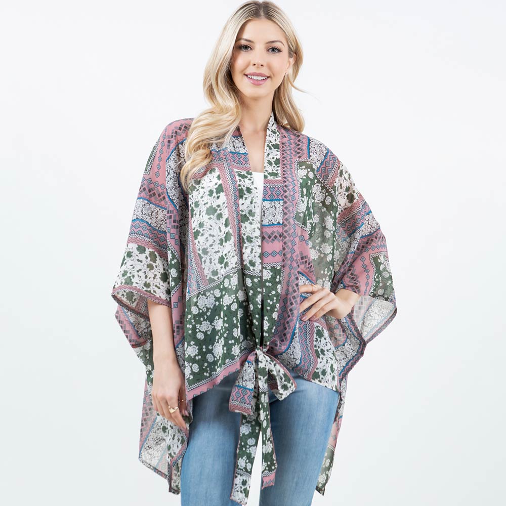 Lightweight Short Sleeves Floral Patchwork Pattern Open Front Kimono Poncho