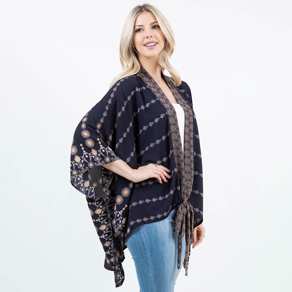 • Flowy open front kimono wrap designed with a relaxed silhouette and front tie detail for effortless styling. Ideal for layering over tanks or tees, it adds light coverage, movement, and a polished finish to everyday outfits, casual wear, or travel looks while remaining comfortable and easy to wear.