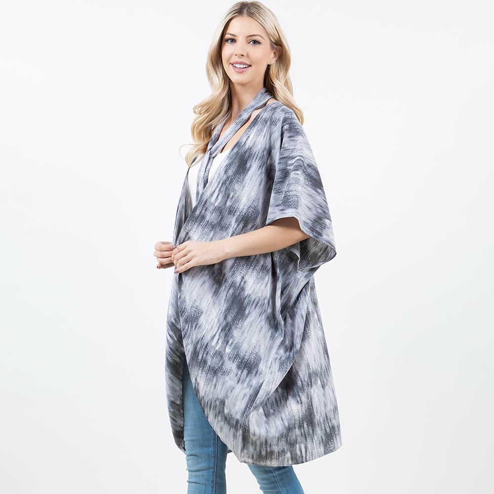 • Flowy kimono-style wrap designed with an abstract brush pattern and an open-front silhouette for effortless layering. Drapes beautifully over tops, dresses, or casual outfits for everyday wear or travel. A versatile fashion piece ideal for gifting and boutique collections seeking relaxed, modern style.