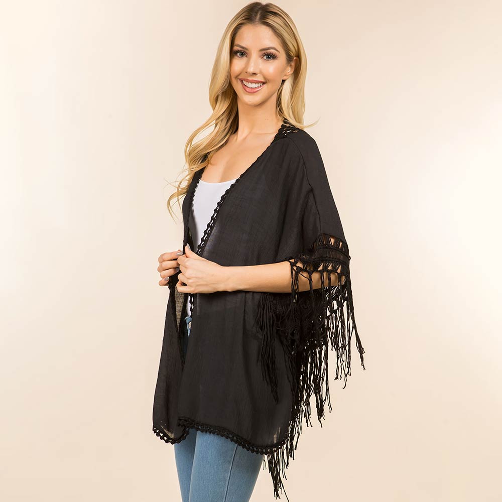 • Open front kimono cardigan designed with soft drape, delicate trim, and flowing fringe accents for effortless layering. Ideal for styling over tanks or dresses, it adds movement, coverage, and a relaxed yet polished finish for everyday outfits, travel looks, and casual occasions.