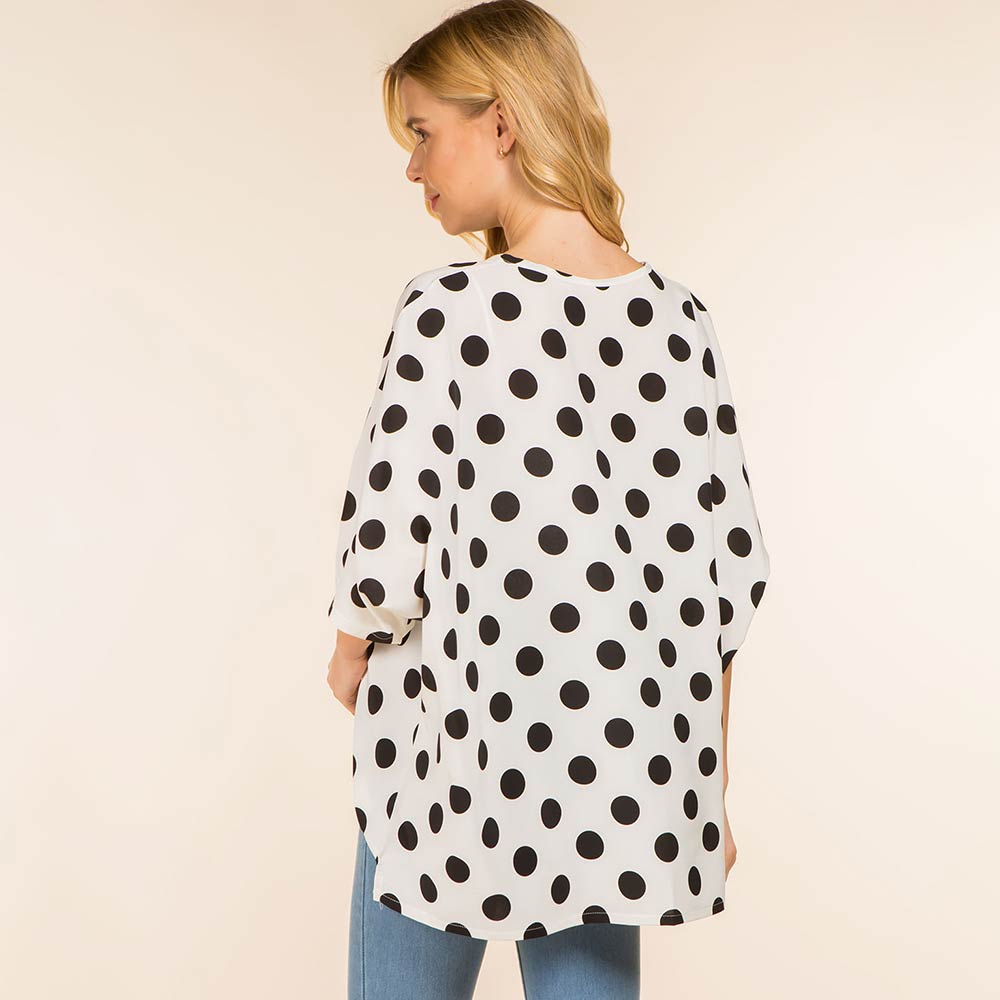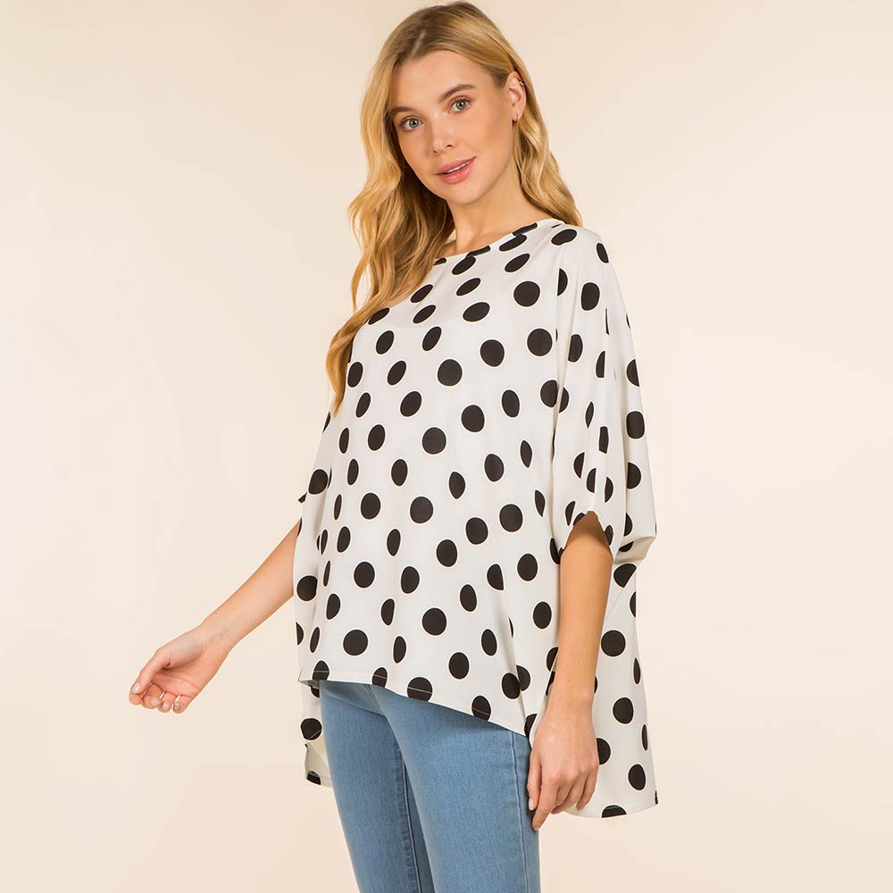 Details • Size : One Size • Material : 100% Polyester • Flowy poncho-style top designed with an allover polka dot pattern and a relaxed silhouette for effortless comfort and style. Drapes beautifully for everyday wear, travel, or casual outings. Easy to pair with jeans or leggings, making it a versatile fashion piece for gifting and boutique collections.
