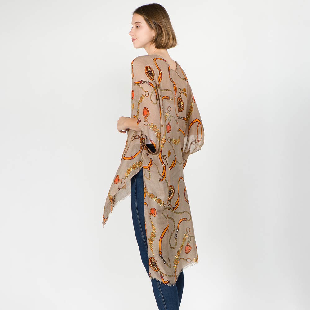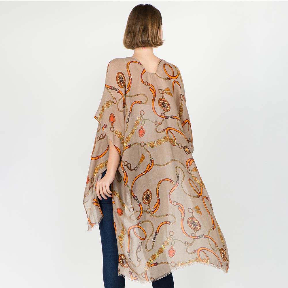 Details • Size : One Size • Material : 100% Polyester • Elegant open front kimono wrap featuring a bold chain-inspired motif and fluid drape. Designed for easy layering over everyday outfits, this versatile silhouette adds statement style for casual wear, travel looks, boutique collections, and elevated resort-inspired styling. Perfect for year-round accessory merchandising.