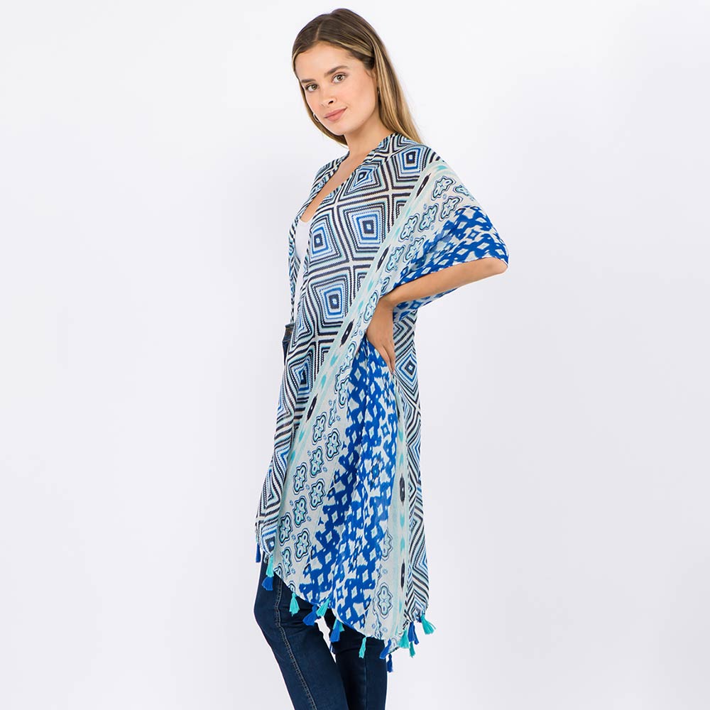 • Statement kimono cover up featuring an eye-catching geometric pattern and flowing open-front design. Finished with tassel accents for added movement, this versatile layering piece is ideal for boutique displays, resort wear edits, and effortless styling from casual outings to vacation looks.