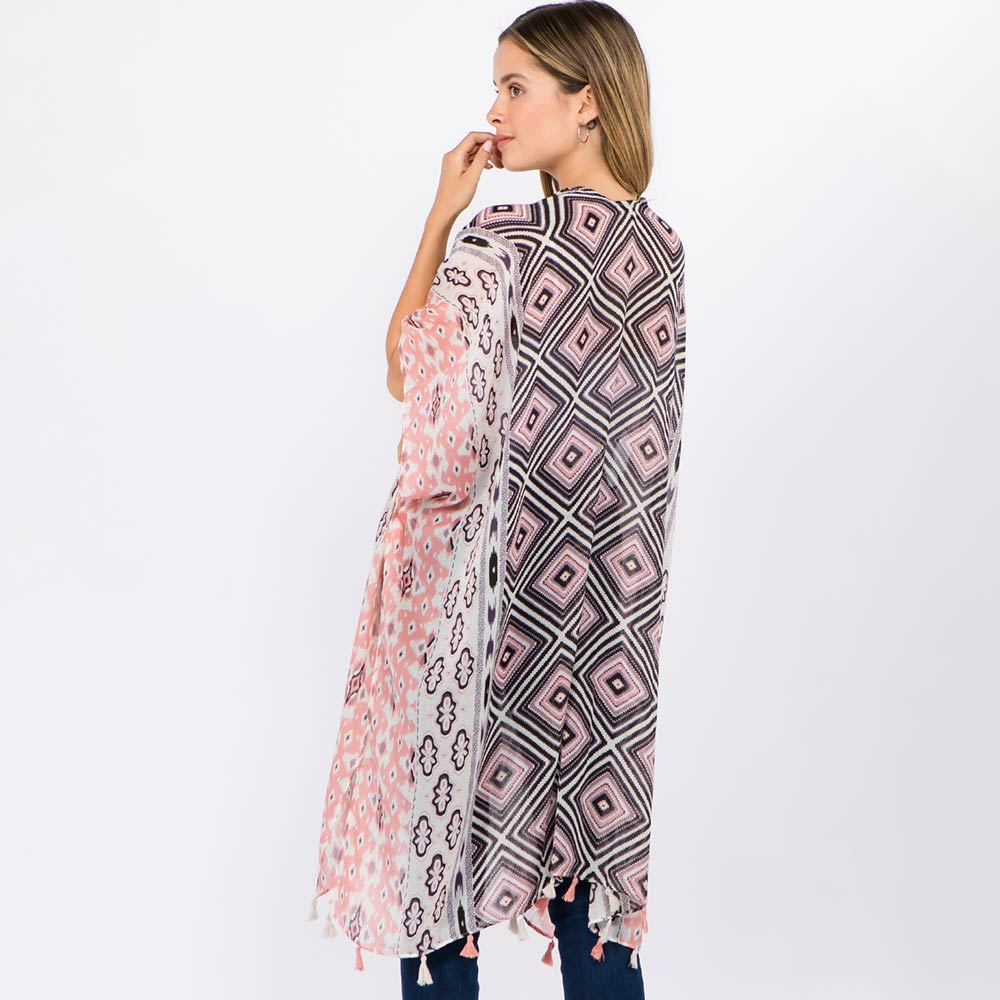 • Statement kimono cover up featuring an eye-catching geometric pattern and flowing open-front design. Finished with tassel accents for added movement, this versatile layering piece is ideal for boutique displays, resort wear edits, and effortless styling from casual outings to vacation looks.