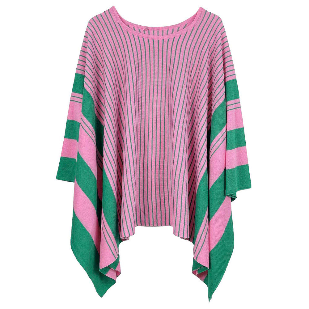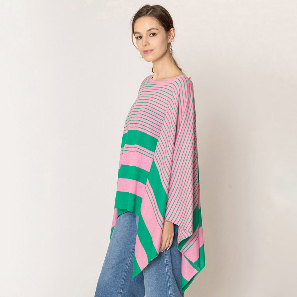 Details • Size : 51.2" X 25.6" • Material : 100% Acrylic • This loose fit knit top features a mix of vertical and horizontal stripes with wide sleeves for a modern silhouette. Its relaxed drape and bold pattern make it a versatile choice for layering or wearing alone in both casual and chic outfits.