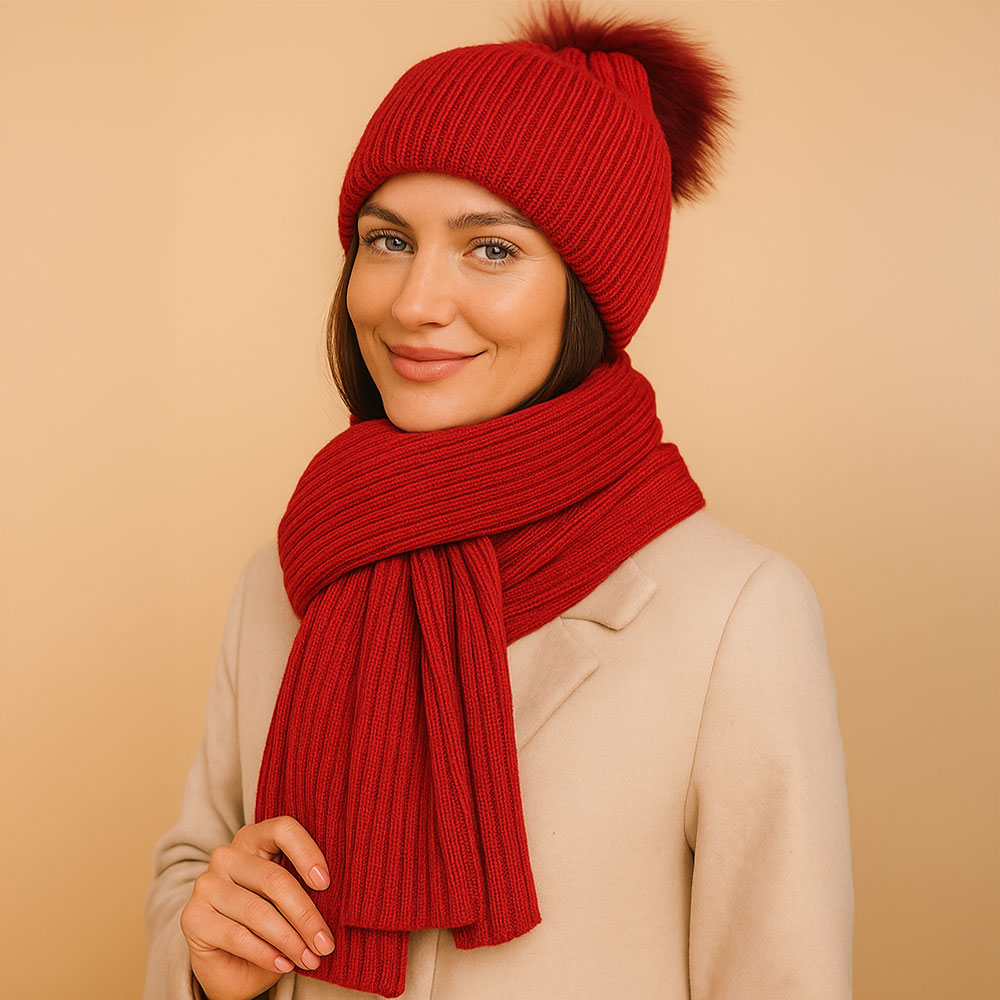 Details • Size : One Size • Material : 56% Rayon, 20% Nylon, 24% Polyester • Pom Material : 100% Genuine Fur • Soft ribbed knit scarf and pom beanie set designed for cozy winter warmth. The matching textured pattern adds a stylish touch, while the plush pom accent elevates any cold-weather outfit. Perfect for everyday wear, gifting, or travel during chilly days.