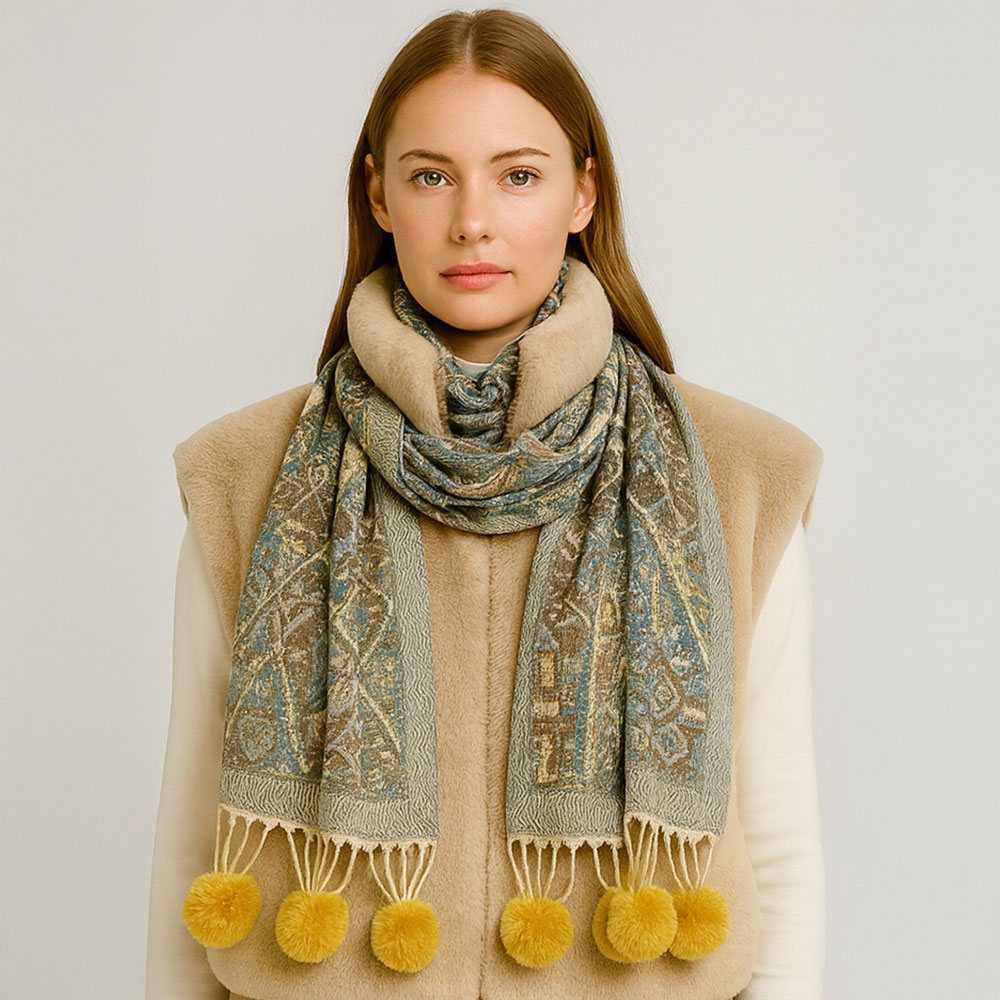 Elegant Patterned Pom Tassel Accent Winter Scarf