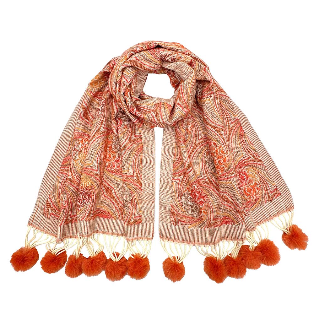 Details • Size : 23.6" X 72.8" • Material : 100% Acrylic • Add a touch of sophistication to any outfit with this beautifully patterned scarf featuring soft pom tassel accents. Its cozy, lightweight design drapes effortlessly, making it perfect for elevating everyday looks and adding stylish warmth throughout the season.