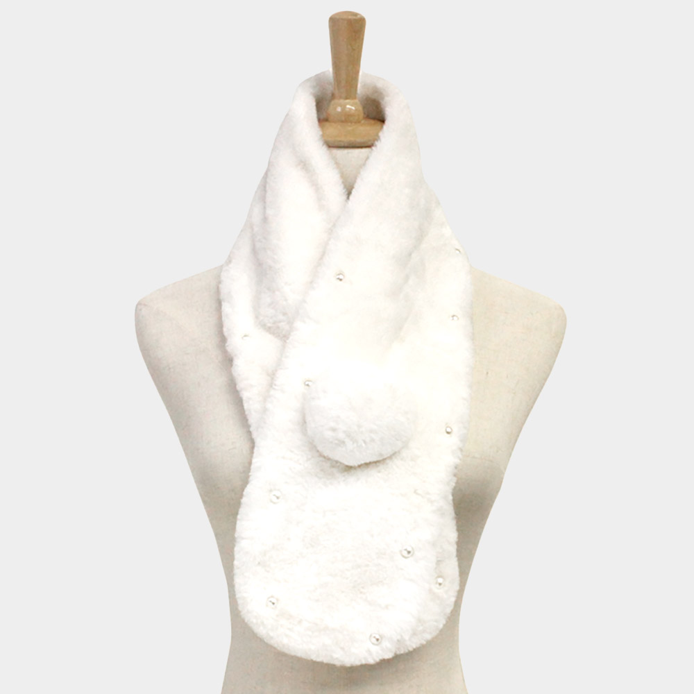 Pearl Embellished Faux Fur Pom Pom Pull Through Scarf