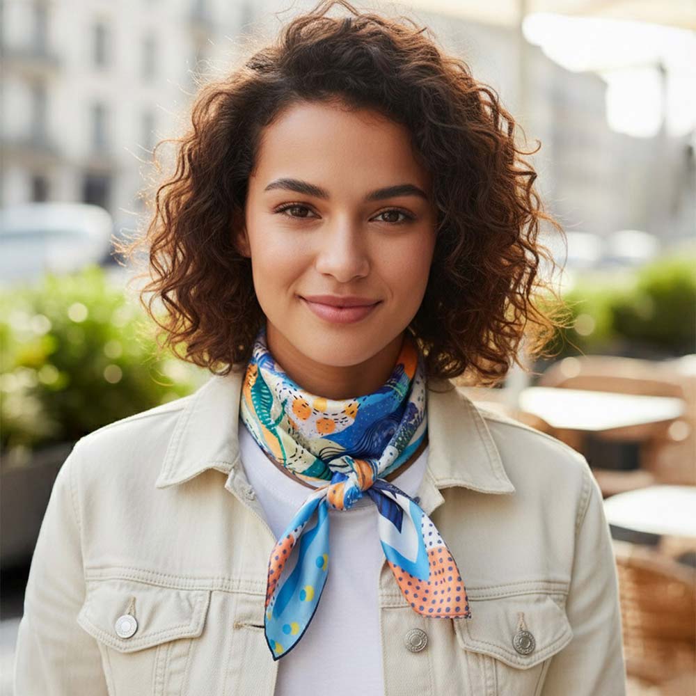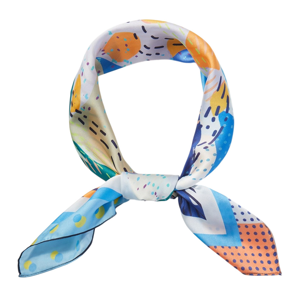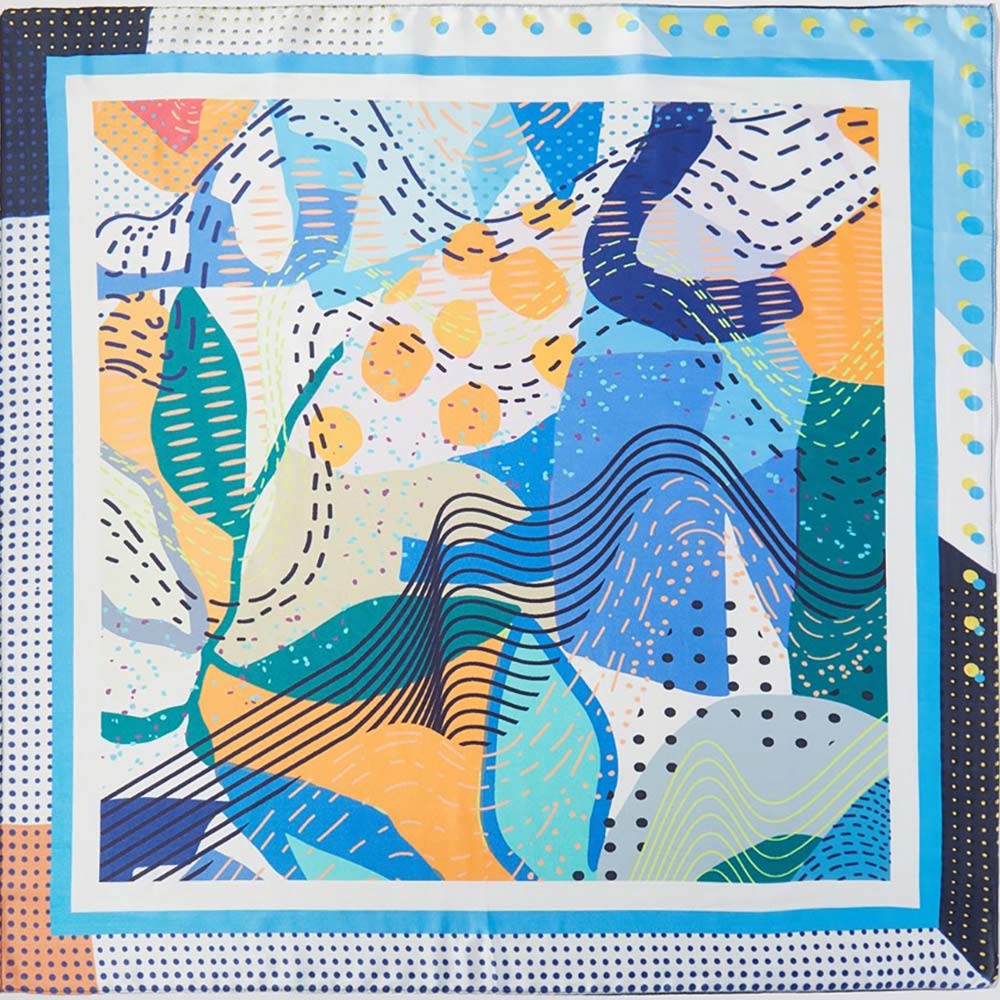 Details • Size : 27.5" X 27.5" • Material : 100% Polyester • Square fashion scarf featuring an expressive abstract art design with dynamic shapes and flowing patterns. Designed for versatile styling as a neck scarf, hair accessory, or bag accent, making it ideal for boutiques seeking modern statement accessories with everyday wear appeal and seasonal flexibility.
