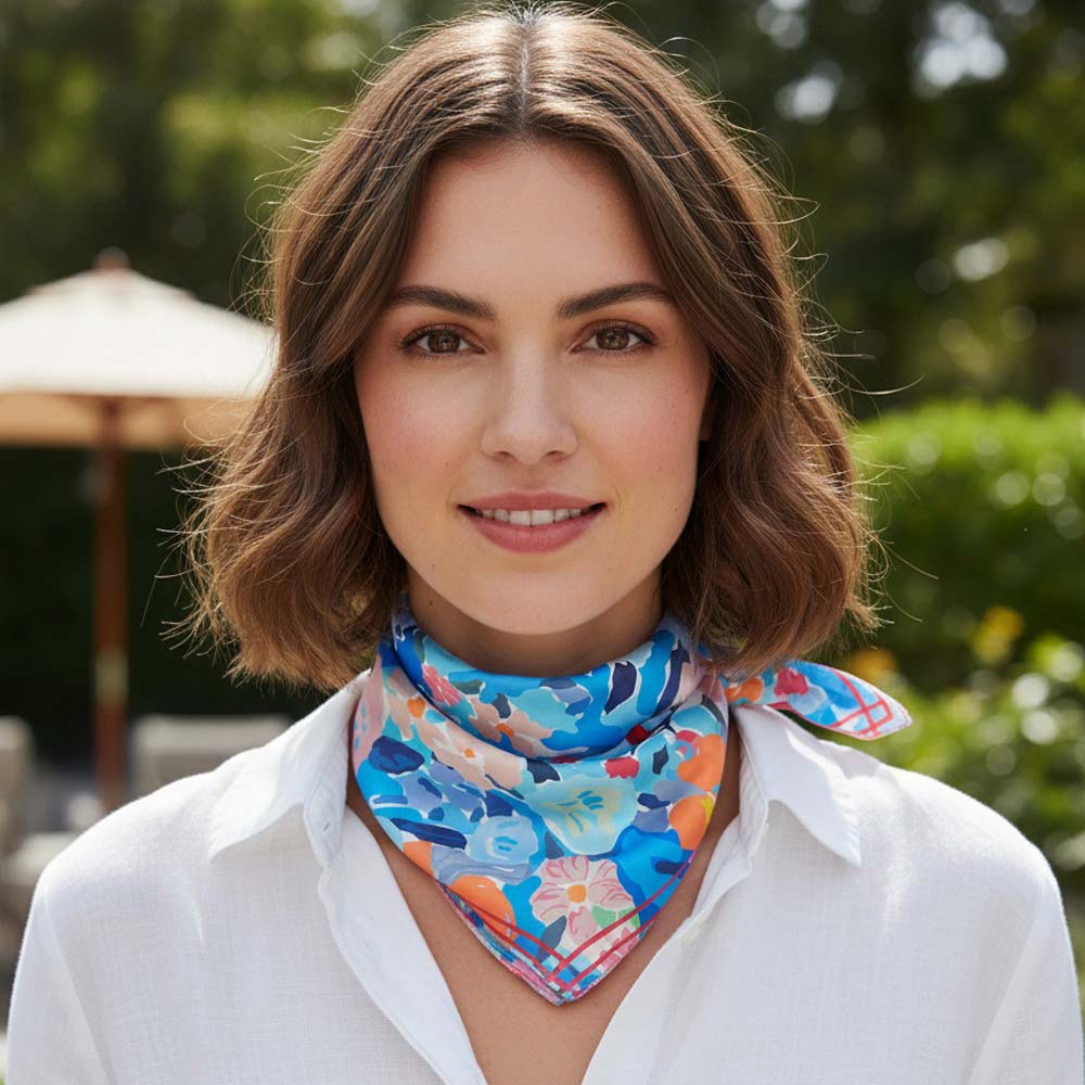 Details • Size : 27.5" X 27.5" • Material : 100% Polyester • Elegant square fashion scarf featuring a soft, painterly floral garden design. Ideal for refined everyday styling on the neck, hair, wrist, or handbag, this versatile accessory adds a graceful, feminine touch to casual looks, office outfits, and boutique-ready fashion collections.