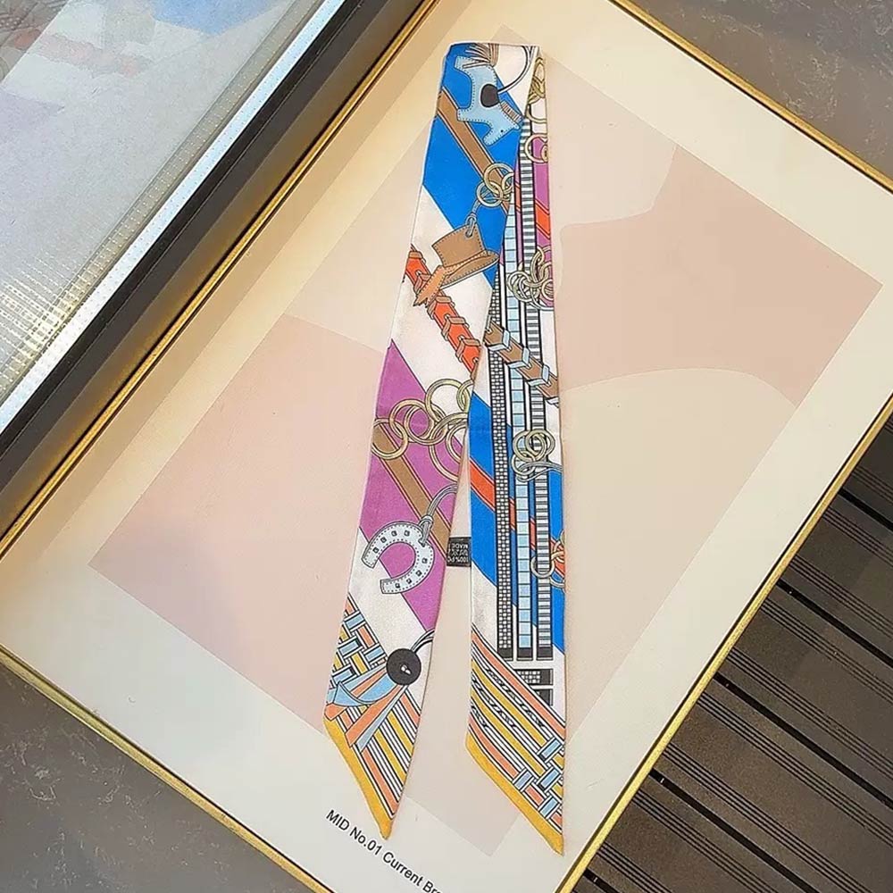 • Stylish skinny scarf featuring an intricate chain and harness inspired print with a sleek twilly silhouette. Designed for versatile styling on the neck, wrist, hair, or handbag handle. Lightweight and easy to wear, perfect for everyday outfits, travel, gifting, and adding a refined, fashion-forward accent to any look.
