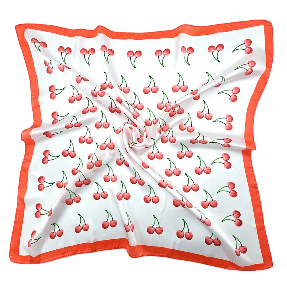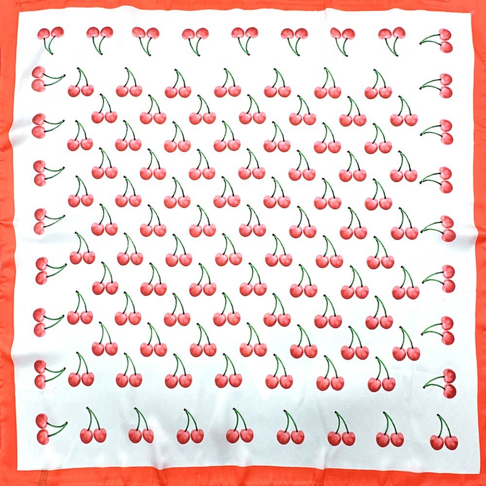 Details • Size : 27.6" X 27.6" • Material : 100% Polyester • This square fashion scarf features a playful cherry-inspired print with a classic bordered layout, offering a bold yet timeless accessory option. Ideal for styling around the neck, hair, bag handles, or wrists, it adds personality to everyday and seasonal looks. A versatile scarf choice for boutiques seeking trend-forward accessories with strong visual appeal, easy styling flexibility, and broad customer appeal for casual, retro, and statement outfits.