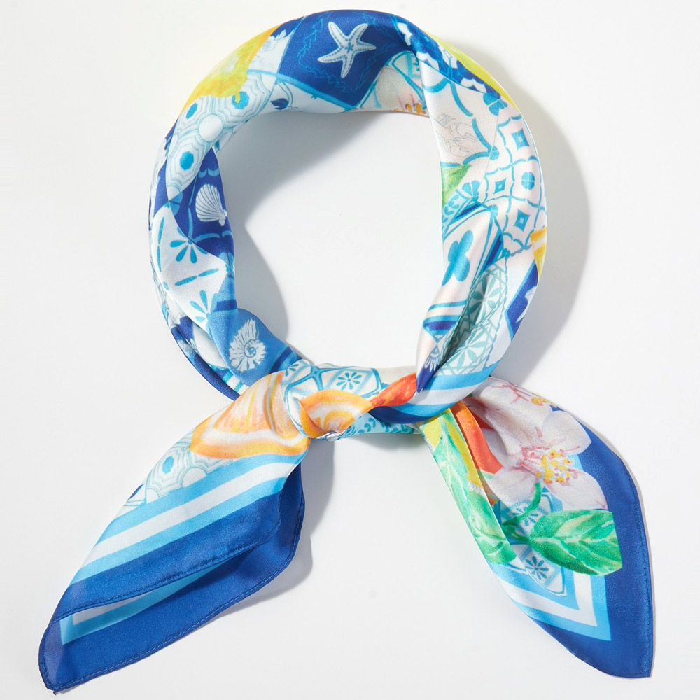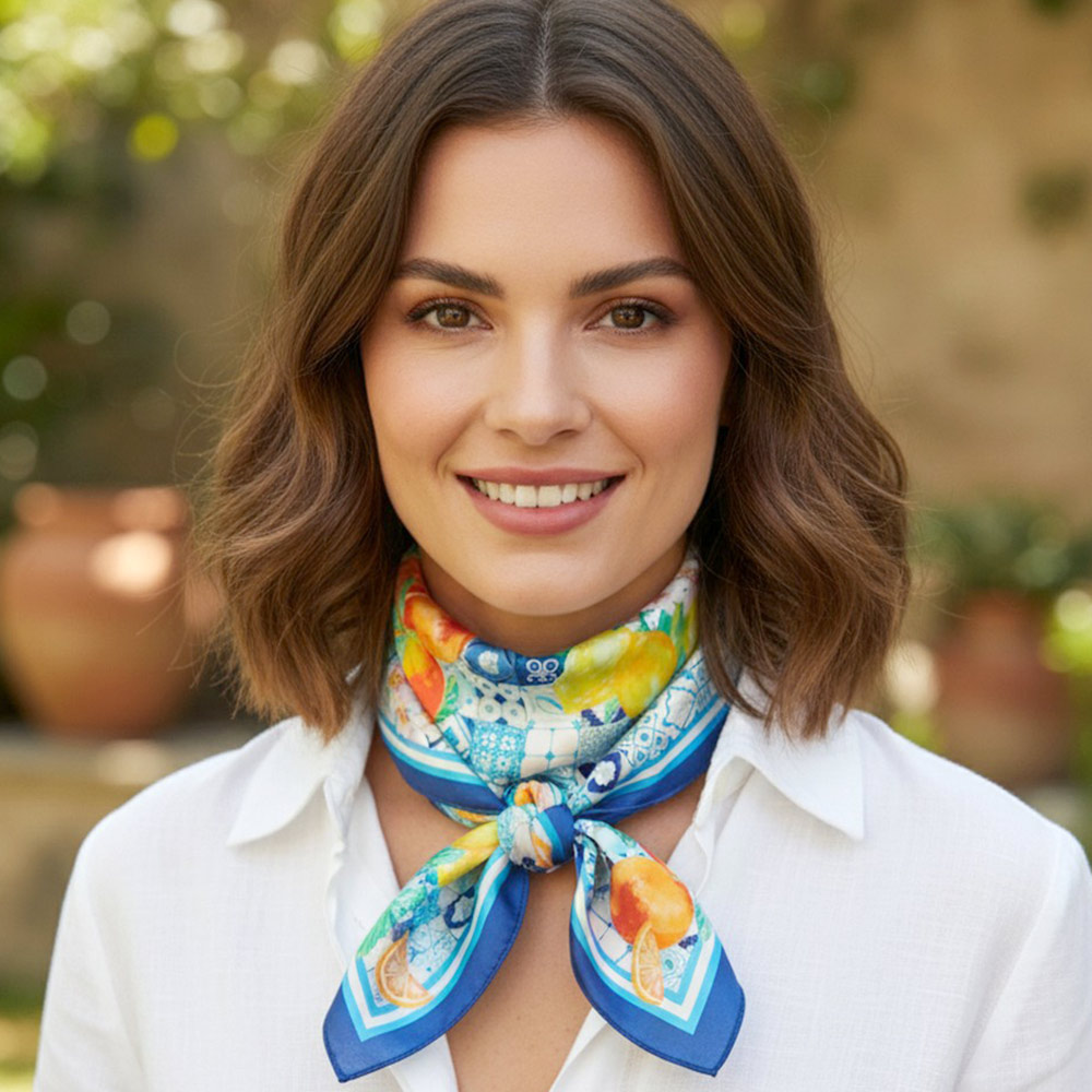 Details • Size : 27.5" X 27.5" • Material : 100% Polyester • Eye-catching square fashion scarf featuring a lively citrus fruit and botanical motif with decorative tile-inspired detailing. Designed for versatile styling on the neck, hair, wrist, or handbag. A statement accessory perfect for boutique collections, resort themes, and everyday outfit layering.