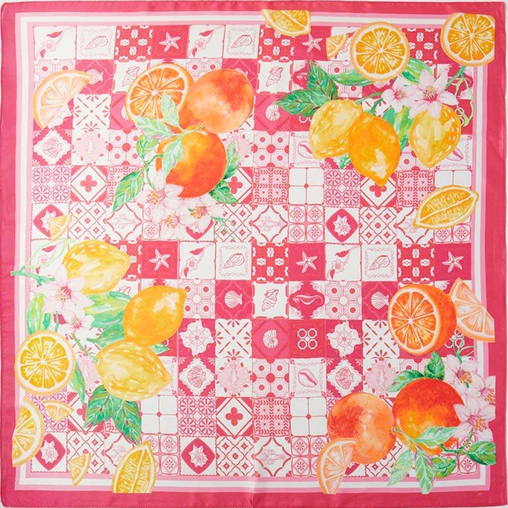 Details • Size : 27.5" X 27.5" • Material : 100% Polyester • Eye-catching square fashion scarf featuring a lively citrus fruit and botanical motif with decorative tile-inspired detailing. Designed for versatile styling on the neck, hair, wrist, or handbag. A statement accessory perfect for boutique collections, resort themes, and everyday outfit layering.