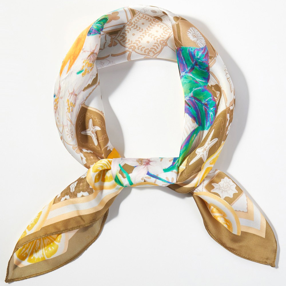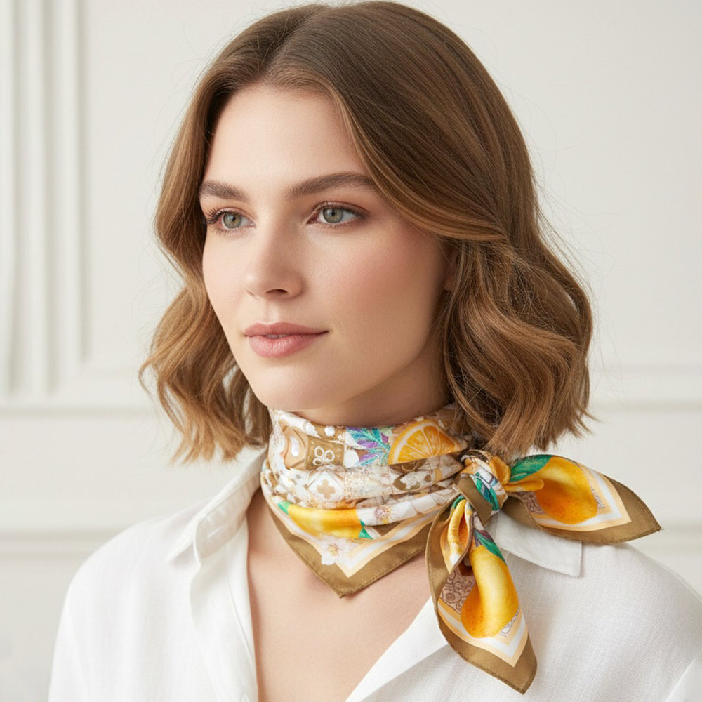 • Eye-catching square fashion scarf featuring a lively citrus fruit and botanical motif with decorative tile-inspired detailing. Designed for versatile styling on the neck, hair, wrist, or handbag. A statement accessory perfect for boutique collections, resort themes, and everyday outfit layering.