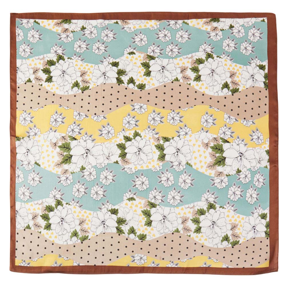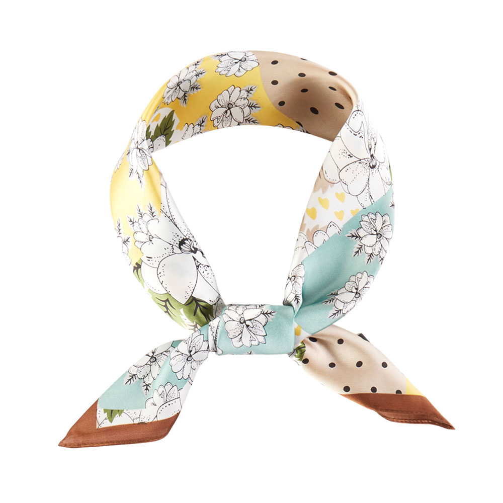 Details • Size : 27.5" X 27.5" • Material : 100% Polyester • This square scarf showcases a charming patchwork of floral motifs and playful dotted accents, offering a soft, artistic look. Lightweight and versatile, it adds a refined touch to everyday outfits, perfect for styling around the neck, hair, or as an accessory on bags.