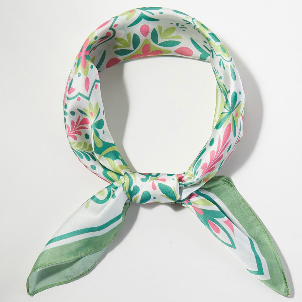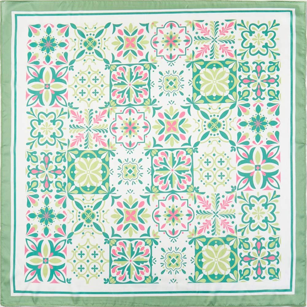 Details • Size : 27.5" X 27.5" • Material : 100% Polyester • Eye-catching square fashion scarf featuring an intricate Mediterranean tile-inspired pattern. Designed for versatile styling on the neck, hair, wrist, or handbag, this statement accessory adds artistic flair and boutique appeal to everyday outfits, resort looks, and curated fashion collections.