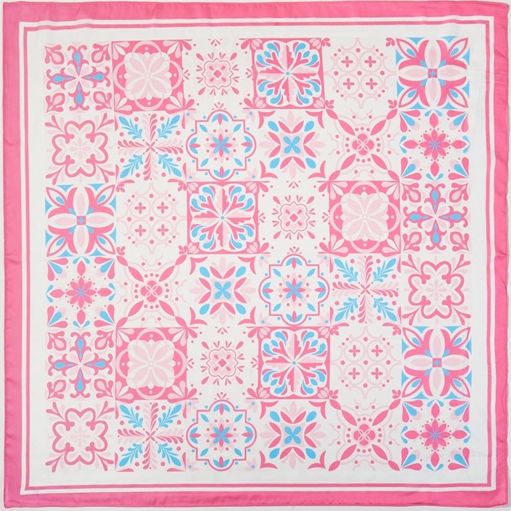 Details • Size : 27.5" X 27.5" • Material : 100% Polyester • Eye-catching square fashion scarf featuring an intricate Mediterranean tile-inspired pattern. Designed for versatile styling on the neck, hair, wrist, or handbag, this statement accessory adds artistic flair and boutique appeal to everyday outfits, resort looks, and curated fashion collections.