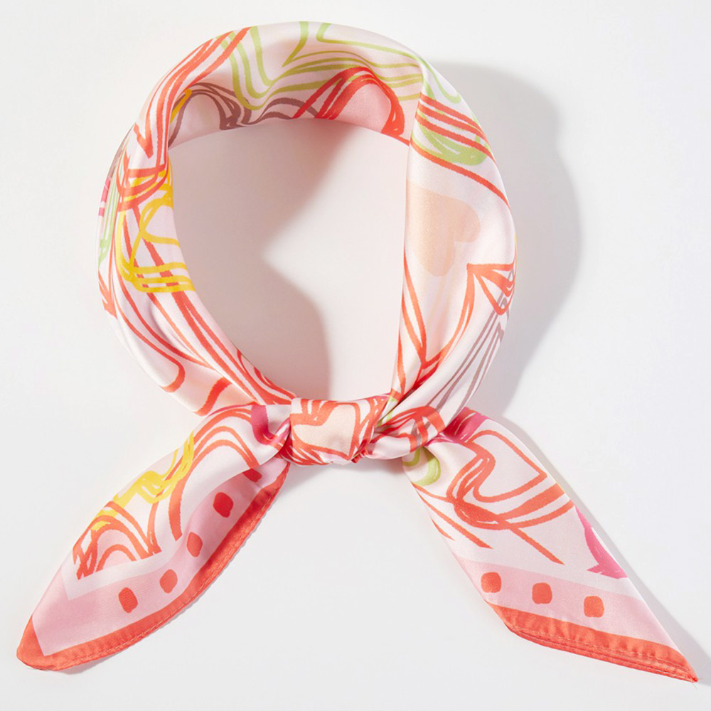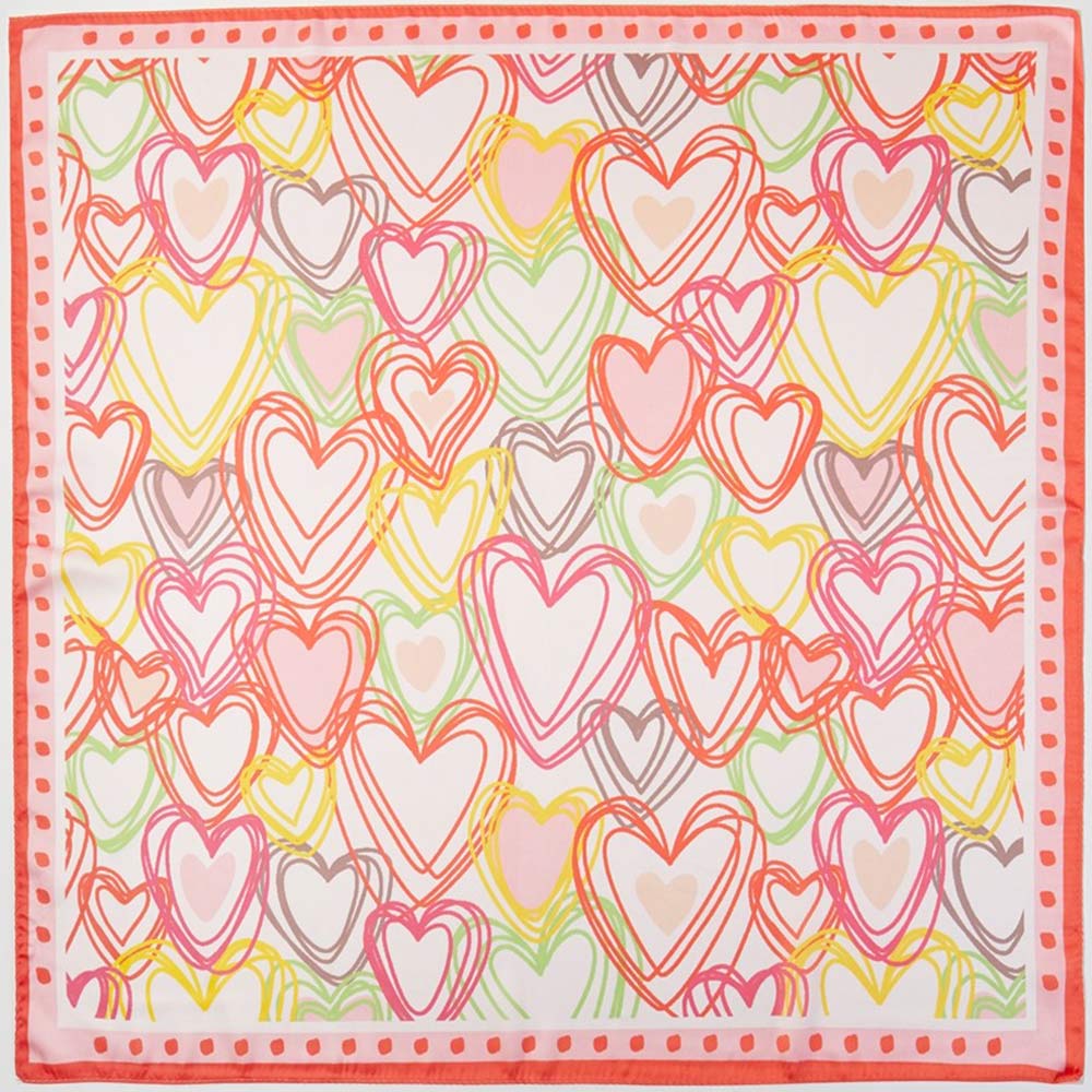 • Charming square scarf featuring an allover heart pattern with a playful, artistic layout. Designed for versatile styling around the neck, hair, wrist, or handbag. A trendy accessory ideal for gift shops, boutiques, seasonal displays, and everyday fashion looks.