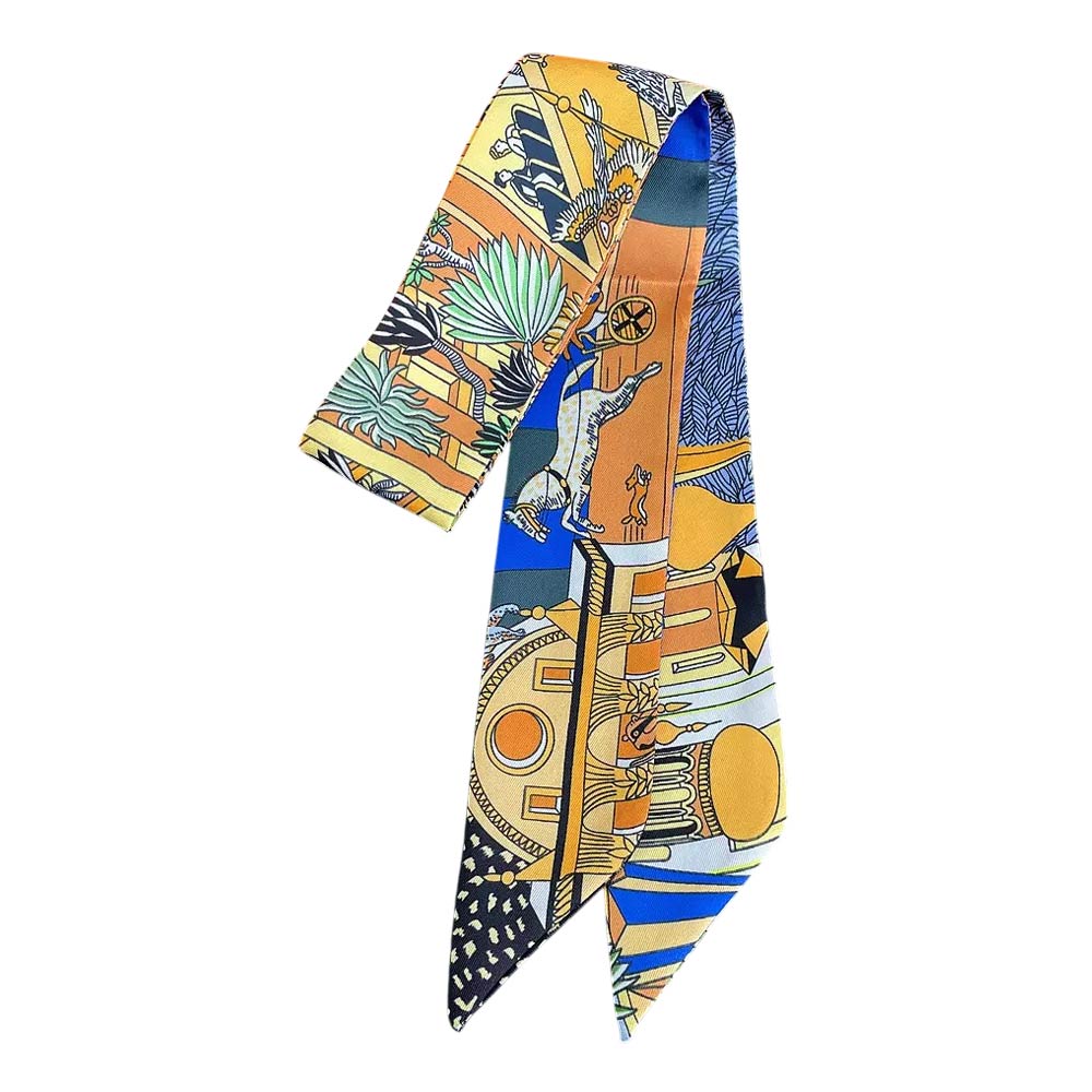 • Artistic skinny scarf featuring an illustrated scene print with a refined twilly silhouette for modern styling. Designed for versatile wear around the neck, wrist, hair, or handbag handle. Lightweight and easy to style, perfect for everyday outfits, travel, gifting, and adding a creative, fashion-forward accent to any look.