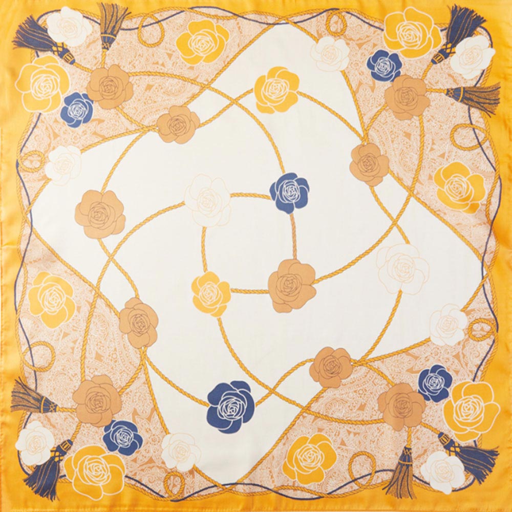 • Capture a chic, preppy look with this charming square satin-feel scarf. The unique design features stylized roses connected by an intertwined rope pattern, framed by a decorative tassel border and subtle paisley elements. The smooth, luxurious fabric and vibrant, balanced colors make this accessory a delightful statement piece for a classic, sophisticated style. Perfect as a neckerchief or tied to a handbag.