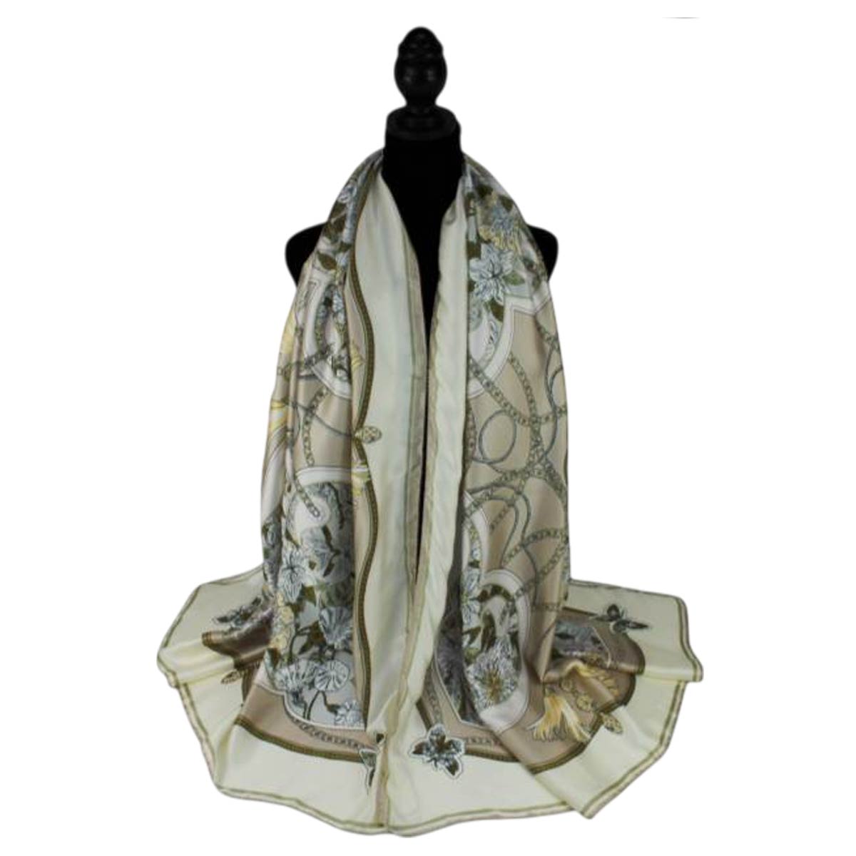 Details • Size : 35" X 78" • Material : 100% Viscose • Breathable, Lightweight, Skin-friendly and Soft • This ornate square scarf showcases a classic symmetrical motif with floral medallions and elegant chain-inspired detailing for a refined, timeless look. Ideal for neck styling, hair accents, handbag wraps, or display, it’s a versatile accessory for boutiques, gifting, and elevated everyday outfits.