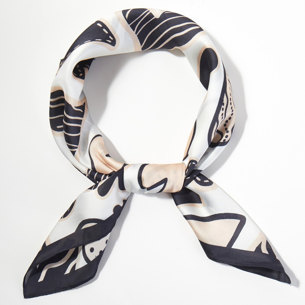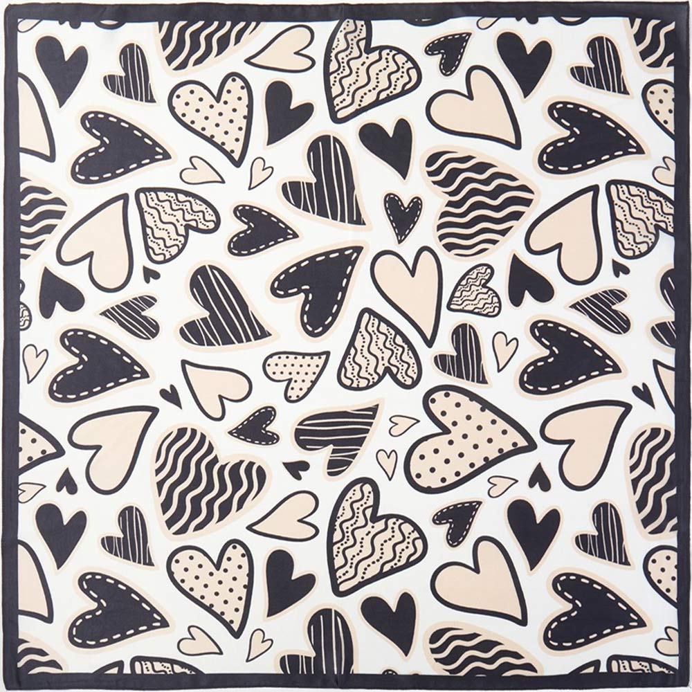 Details • Size : 27.5" X 27.5" • Material : 100% Polyester • Stylish square scarf featuring an abstract heart print with playful shapes and modern line details. Designed for versatile styling on the neck, hair, wrist, or handbag. A trendy accessory for boutiques, gift shops, seasonal collections, and everyday fashion displays.