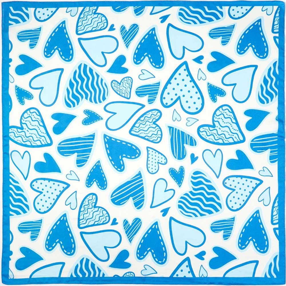 Details • Size : 27.5" X 27.5" • Material : 100% Polyester • Stylish square scarf featuring an abstract heart print with playful shapes and modern line details. Designed for versatile styling on the neck, hair, wrist, or handbag. A trendy accessory for boutiques, gift shops, seasonal collections, and everyday fashion displays.