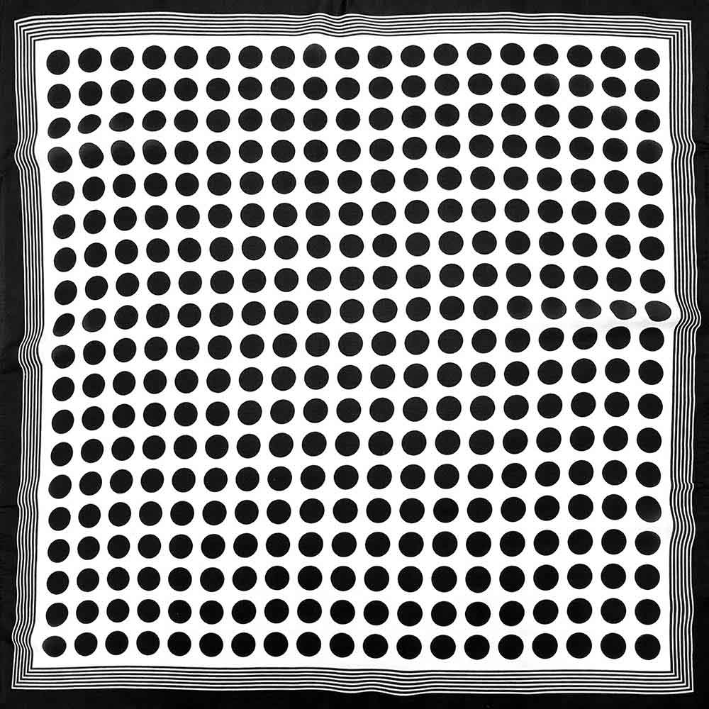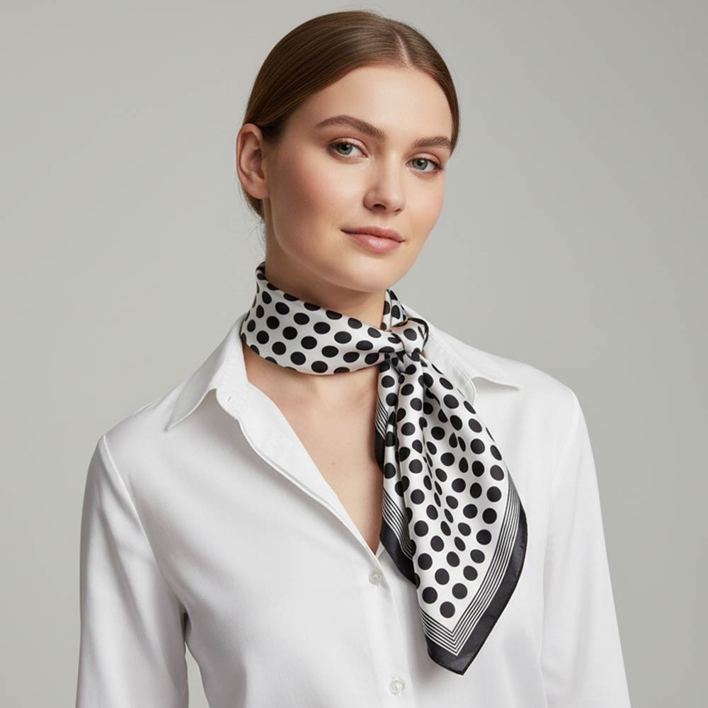 Details • Size : 27.6" X 27.6" • Material : 100% Polyester • This square fashion scarf features a classic polka dot pattern paired with a clean border design for timeless, versatile styling. Easy to wear around the neck, in the hair, or tied to a bag, it adds a polished accent to casual and dress looks. A go-to accessory for everyday collections, gift displays, and boutique assortments, offering strong visual appeal and effortless mix-and-match potential.