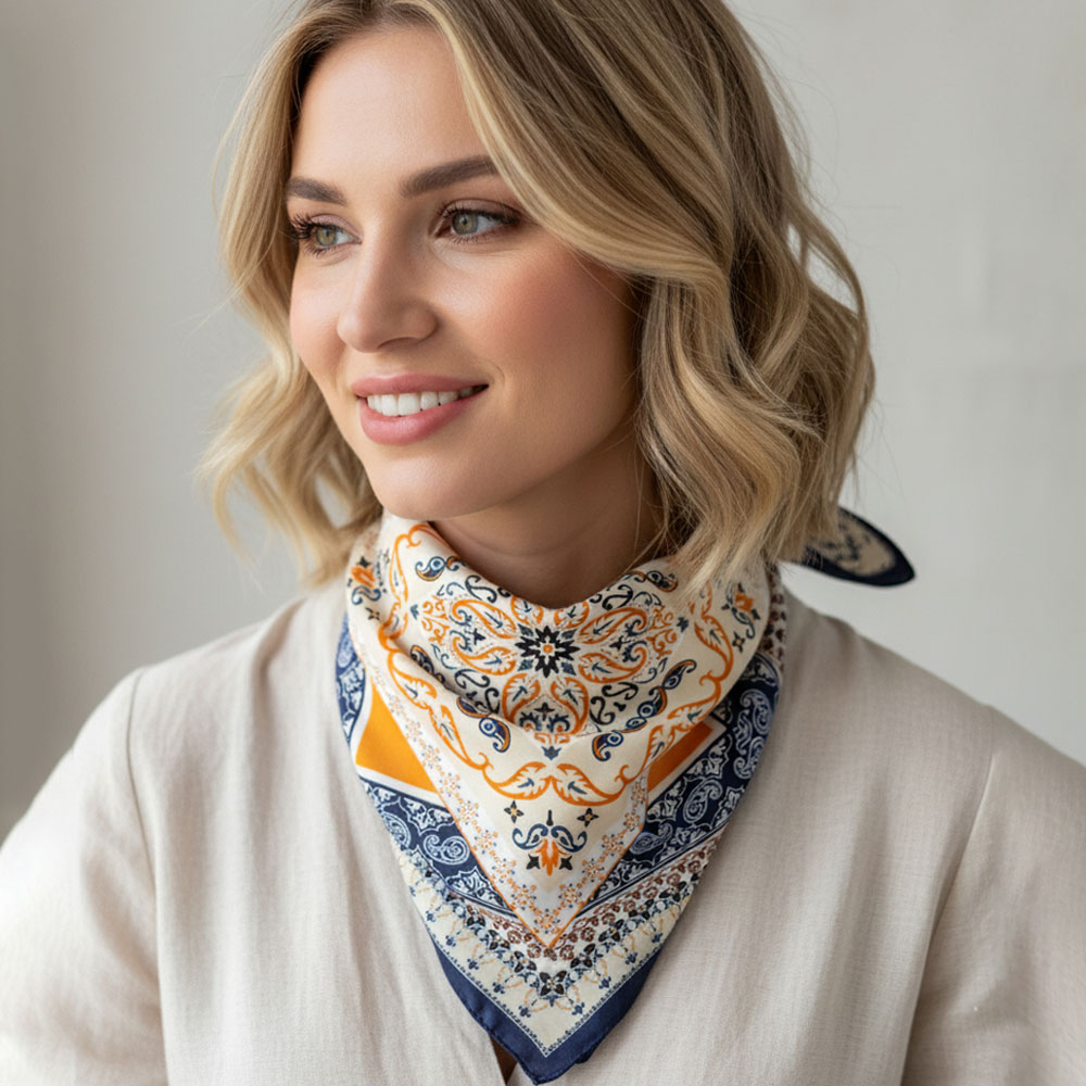 Details • Size : 27.5" X 27.5" • Material : 100% Polyester • Vintage-inspired square fashion scarf featuring an elegant baroque print with a smooth, lightweight drape for versatile styling. Wear it as a neck scarf, hair accessory, or handbag accent to elevate everyday outfits, office attire, and travel looks. A classic gift choice for anyone who loves timeless patterns.