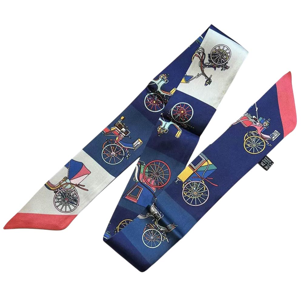 • Stylish twilly scarf featuring a classic bicycle-inspired pattern designed for versatile accessorizing. Perfect for wrapping on handbags, tying around the neck, wrist, or hair for a polished accent. A lightweight fashion accessory that adds charm, personality, and everyday elegance to casual or dressed-up looks.