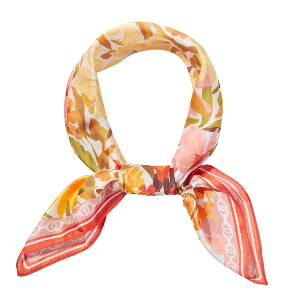 Details • Size : 27.5" X 27.5" • Material : 100% Polyester • Elegant square fashion scarf showcasing a vintage-inspired floral garden pattern with layered botanical details. Designed for versatile styling on the neck, hair, wrist, or handbag, this timeless accessory adds a soft romantic touch to everyday outfits, seasonal collections, and curated boutique assortments.