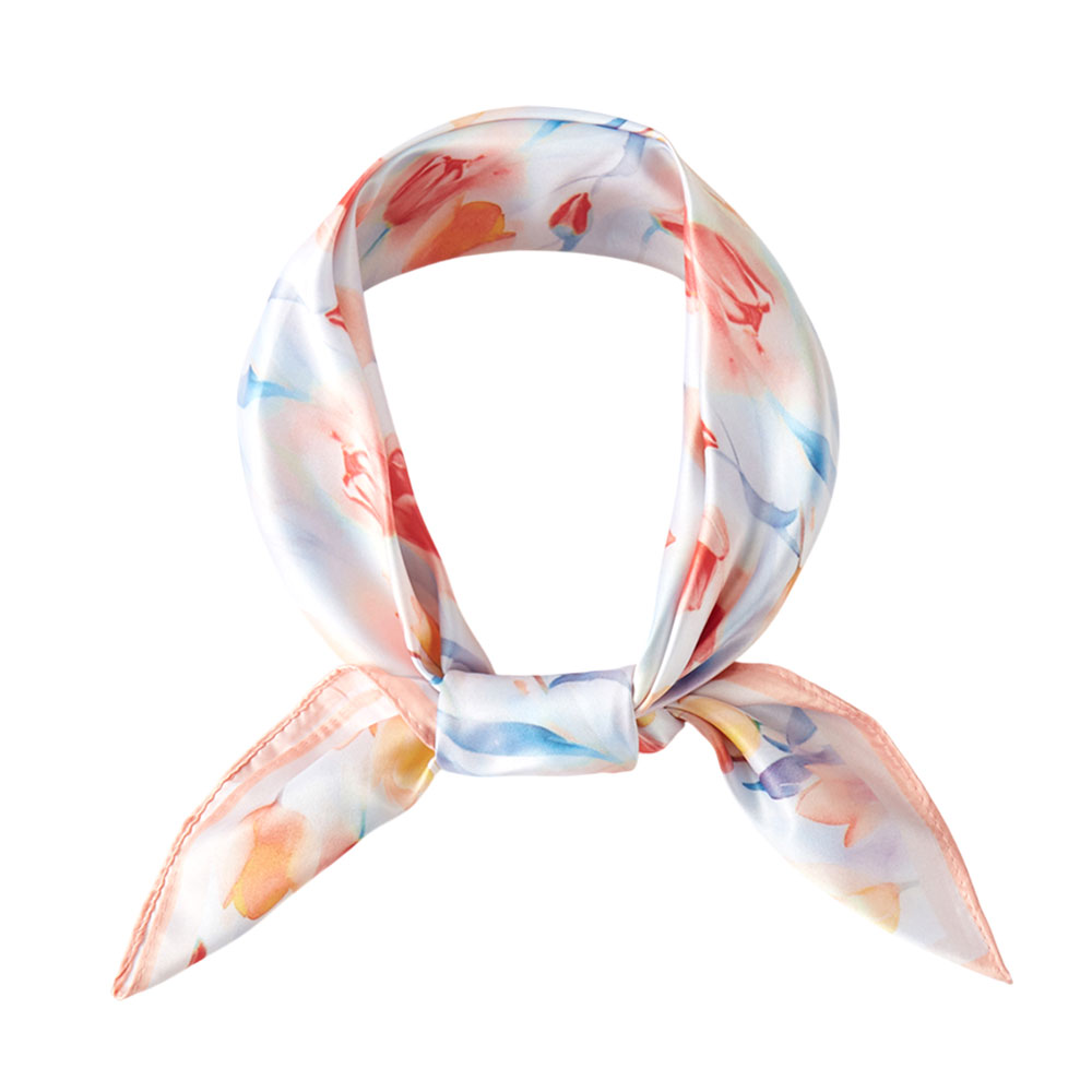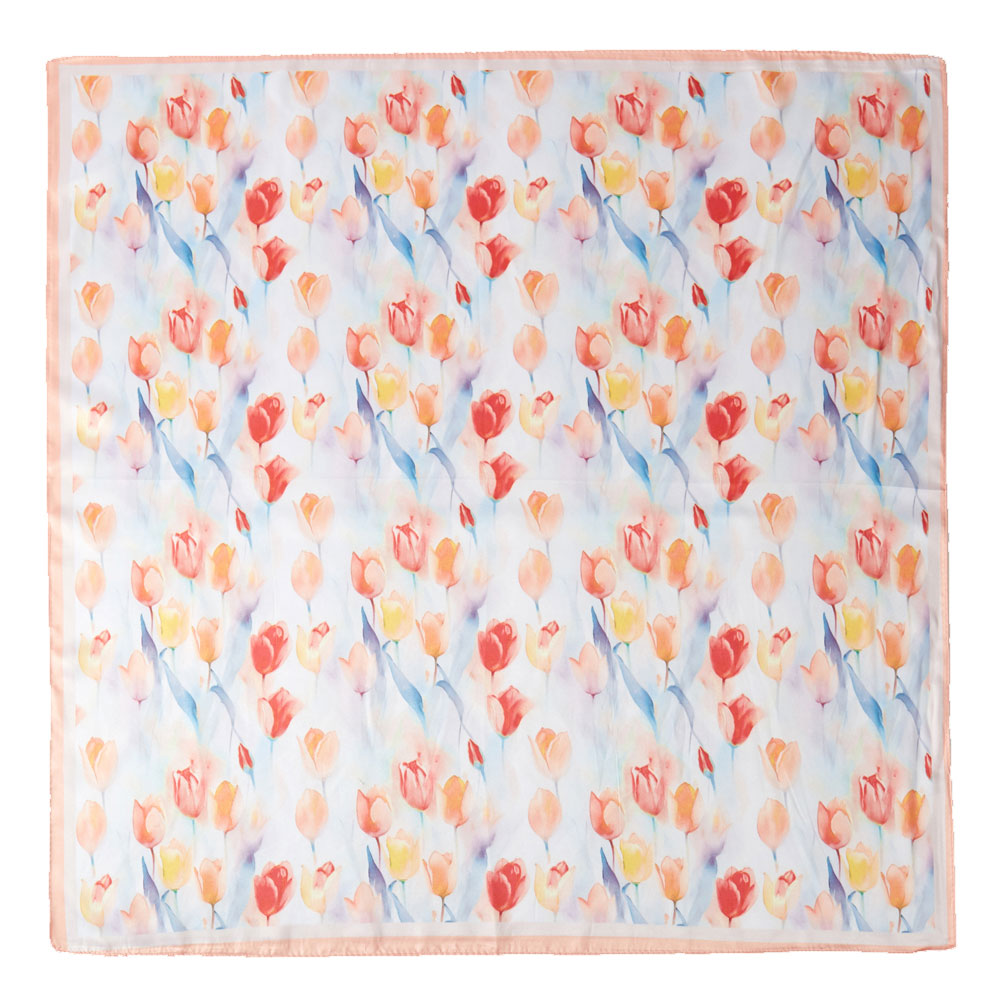 • This square scarf features a soft watercolor tulip design that adds a fresh, romantic touch to any look. Its lightweight feel and versatile styling options make it ideal as a neck scarf, hair accessory, or bag accent, bringing graceful charm to everyday outfits.