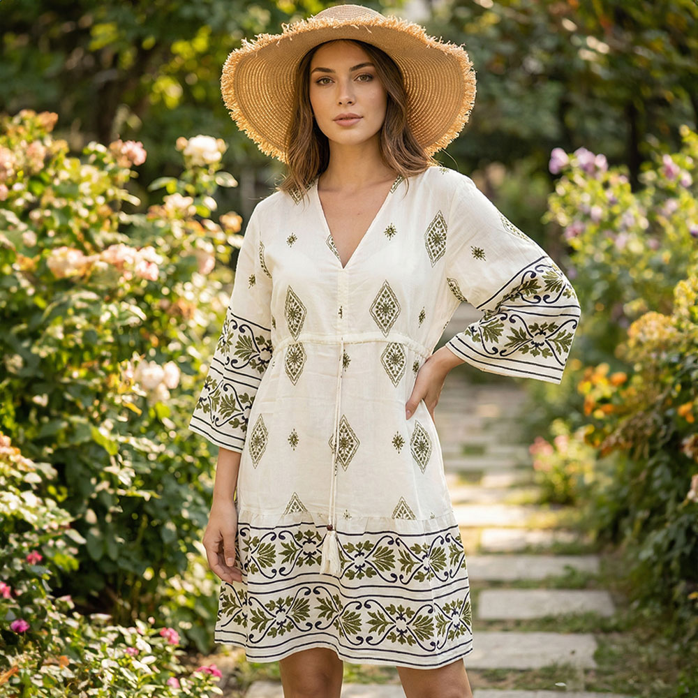 • Elegant V-neck tunic dress with artistic prints, wide sleeves, and tassel accents—perfect for beach vacations and summer outings.