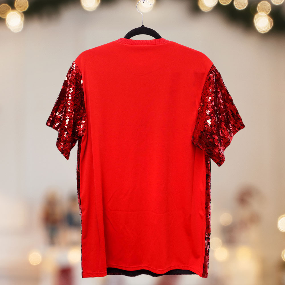 Details • Size : One Size • Bust Size : 42" - 45" L, Length : 30" L • Material : 100% Polyester • Sparkle with seasonal charm in this plus size sequin Christmas tree dress, featuring playful holiday motifs and a shimmering finish. Perfect for Christmas parties, family gatherings, or festive photos, this cheerful dress brings joy and holiday spirit to every celebration.