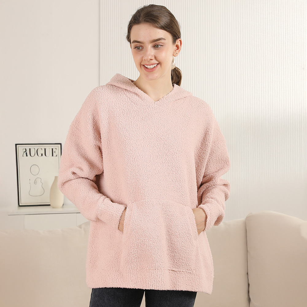 • Stay comfortable in this oversized hooded pullover featuring a relaxed fit and front pocket for added practicality. Designed with a plush texture and casual silhouette, it’s a versatile piece perfect for layering or wearing on its own during cooler days.