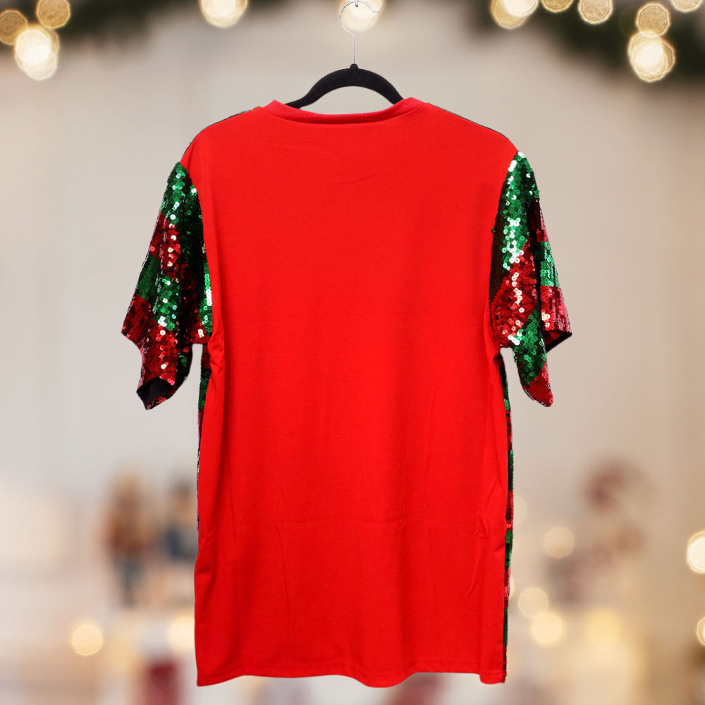 Details • Size : One Size • Bust Size : 42" - 45" L, Length : 30" L • Material : 100% Polyester • Celebrate the season in style with this plus size “Holly Jolly” sequin dress, designed for comfort and sparkle. Featuring a festive striped pattern and playful holiday lettering, it’s the perfect choice for Christmas parties, gatherings, and joyful holiday photo moments.