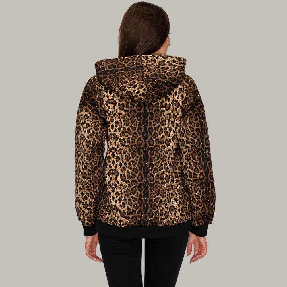 Details • Size : One Size • Material : 100% Polyester • Stylish Rhinestone Studded leopard print zip-up jacket featuring a relaxed silhouette, hooded detail, front pockets and comfortable everyday wear. A versatile animal print layer perfect for casual looks, easy outfitting and adding standout pattern to any wardrobe.