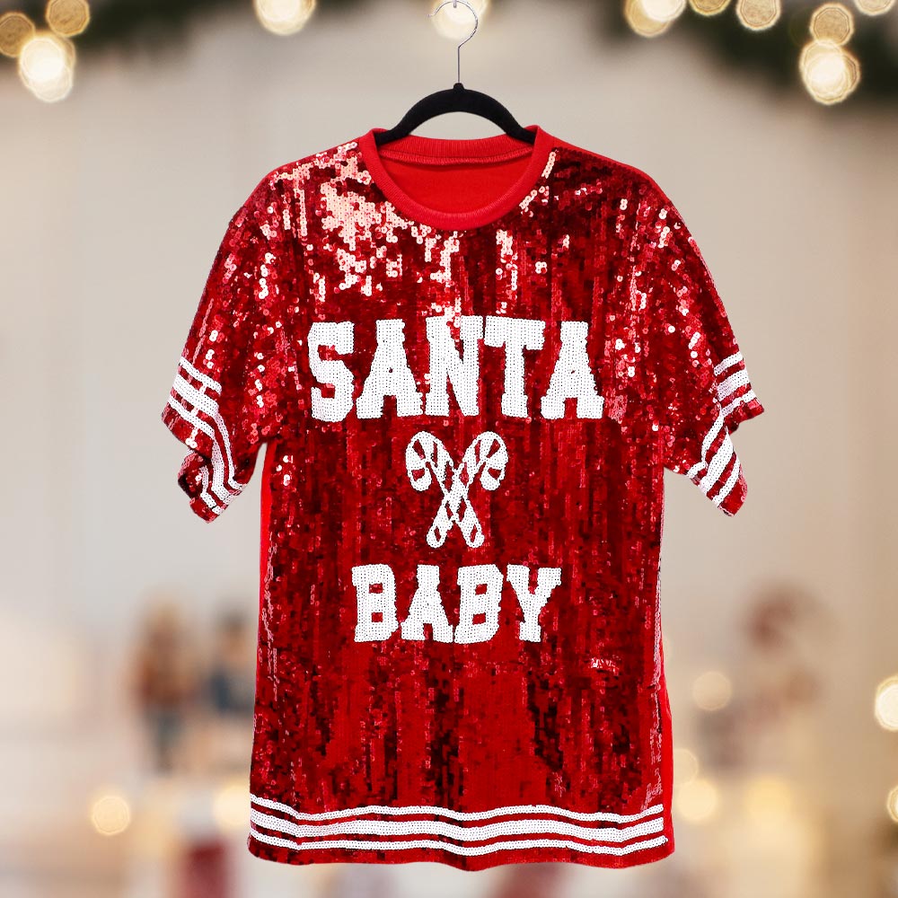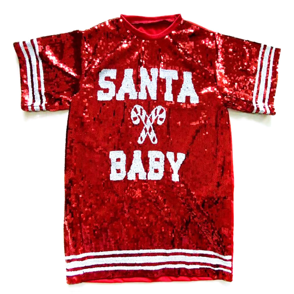 Details • Size : Large • Bust Size : 42" - 45" L, Length : 30" L • Material : 100% Polyester • Get into the holiday spirit with this plus size “Santa Baby” sequin dress, designed to sparkle at every festive occasion. Featuring a fun slogan and shimmering details, it’s perfect for Christmas parties, gatherings, or any event where you want to shine with holiday cheer.