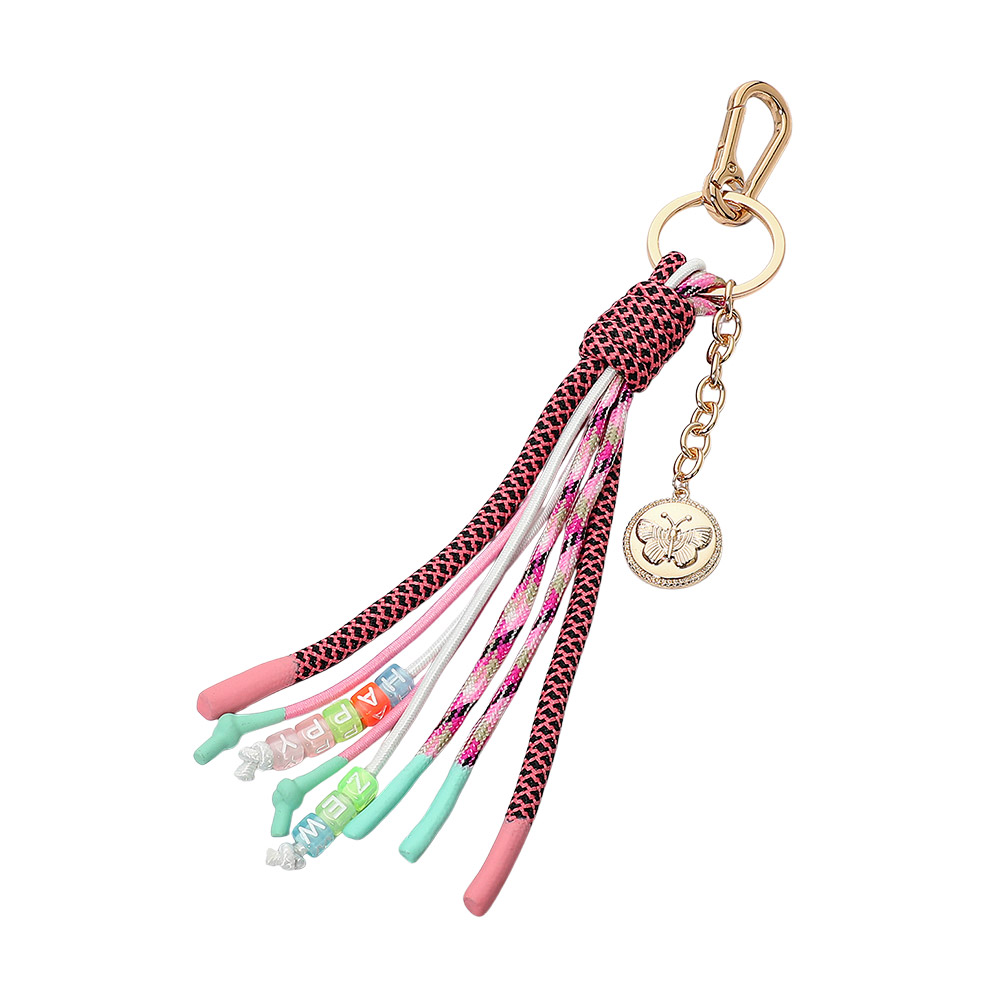 Details • Size : 8.5" L • Decorative tassel keychain with layered cord detailing, bead accents, and a dangling charm, finished with a sturdy clip for easy attachment to keys, bags, or accessories. Adds playful texture and movement to everyday essentials while blending fashion with practical function. • Lead and Nickel Compliant