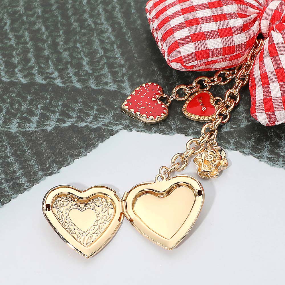 Details • Size : 6.5" L, 3.5" X 5.25" • Decorative bag charm keychain featuring a soft bow accent paired with dangling heart and locket charms. Designed to add a romantic, playful touch to handbags, backpacks, and keys. Ideal for gifting, seasonal collections, and boutique displays seeking charming statement accessories. • Lead and Nickel Compliant